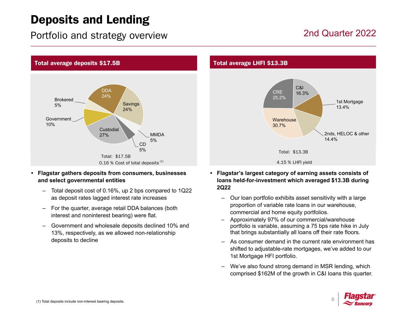 7 2nd Quarter 2022 • Noninterest mortgage revenue dropped to 14% of total revenue, from 40% in the comparable quarter in the prior year. • Net interest margin has expanded to 3.69% from 3.11% last quarter and 2.90% in the year-ago quarter. Total Revenue • Our mortgage expense ratio declined to 1.14% of closing volume as staffing reductions across the quarter were made as expected volumes decreased. • A total of 550 positions have been eliminated through reductions and attrition in the mortgage business. Noninterest expense Total revenue and expense 1. Includes Servicing revenue/expense 2. Non-GAAP number, please see reconciliations on pages 39 - 40. Total revenue ($mm) $435 $461 $383 $325 $324 183 195 181 165 193 78 79 84 86 87 174 187 118 74 44 Net interest income Noninterest income - Non-Mortgage Noninterest income - Mortgage 2Q21 3Q21 4Q21 1Q22 2Q22 Quarterly adjusted noninterest expense2 ($mm) $290 $281 $285 $258 $253 159 156 164 156 163 131 125 121 102 90 1.03% 1.00% 1.14% 1.24% 1.14% Non-Mortgage NIE Mortgage NIE Mortgage expense 2Q21 3Q21 4Q21 1Q22 2Q22 (1) (1)