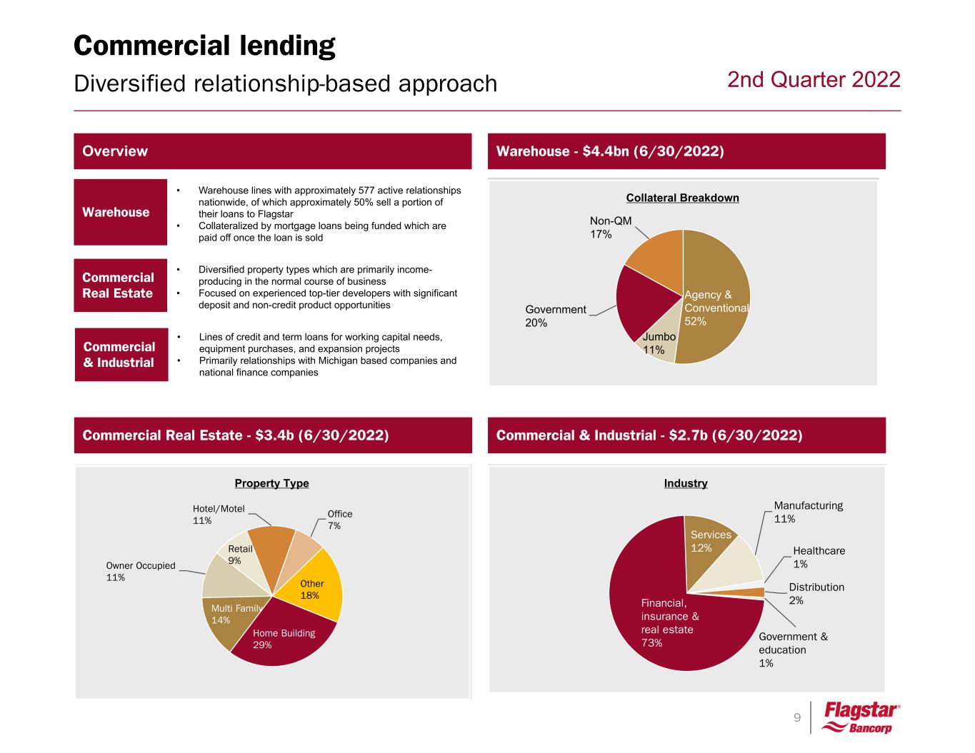 8 2nd Quarter 2022 Deposits and Lending Portfolio and strategy overview • Flagstar gathers deposits from consumers, businesses and select governmental entities – Total deposit cost of 0.16%, up 2 bps compared to 1Q22 as deposit rates lagged interest rate increases – For the quarter, average retail DDA balances (both interest and noninterest bearing) were flat. – Government and wholesale deposits declined 10% and 13%, respectively, as we allowed non-relationship deposits to decline Total average deposits $17.5B Total average LHFI $13.3B • Flagstar’s largest category of earning assets consists of loans held-for-investment which averaged $13.3B during 2Q22 – Our loan portfolio exhibits asset sensitivity with a large proportion of variable rate loans in our warehouse, commercial and home equity portfolios. – Approximately 97% of our commercial/warehouse portfolio is variable, assuming a 75 bps rate hike in July that brings substantially all loans off their rate floors. – As consumer demand in the current rate environment has shifted to adjustable-rate mortgages, we’ve added to our 1st Mortgage HFI portfolio. – We’ve also found strong demand in MSR lending, which comprised $162M of the growth in C&I loans this quarter. DDA 24% Savings 24% MMDA 5% CD 5% Custodial 27% Government 10% Brokered 5% Total: $17.5B 0.16 % Cost of total deposits (1) Total: $13.3B 4.15 % LHFI yield 1st Mortgage 13.4% 2nds, HELOC & other 14.4% Warehouse 30.7% CRE 25.2% C&I 16.3% (1) Total deposits include non-interest bearing deposits.