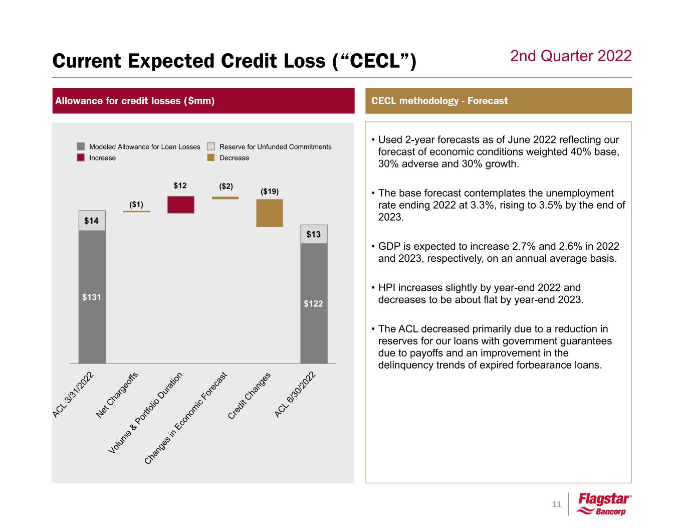 10 2nd Quarter 2022 NPLs and performing TDRs ($mm) 1. Includes early stage delinquencies, defined as 30 to 89 days past due 2. Includes $35 million of first residential mortgage loans that are current in accordance with their forbearance exit plan and have not yet returned to accrual status as of June 30, 2022 3. Excludes nonperforming loans held-for-sale Allowance coverage (% of loans HFI) Delinquencies(1) (% of loans HFI) Nonperforming loan and asset ratios Asset quality $121 $107 $127 $116 $129 33 34 22 23 22 55 58 62 97 99 19 35 32 9 Performing TDRs Consumer NPLs (2) Commercial NPL 6/30/2021 9/30/2020 12/31/2021 3/31/2022 6/30/2022 1.6% 1.3% 1.1% 1.1% 0.9% 2.6% 2.3% 1.7% 1.6% 1.3% Total Total excl. Warehouse 6/30/2021 9/30/2021 12/31/2021 3/31/2022 6/30/2022 0.53% 0.66% 0.70% 0.80% 0.68% 0.57% 0.70% 0.74% 0.84% 0.71% 0.30% 0.37% 0.39% 0.48% 0.42% NPL & TDRs/LHFI NPA/LHFI & OREOs (3) NPA/Total Assets (3) 6/30/2021 9/30/2021 12/31/2021 3/31/2022 6/30/2022 0.67% 0.75% 1.16% 0.90% 0.83% 6/30/2021 9/30/2021 12/31/2021 3/31/2022 6/30/2022