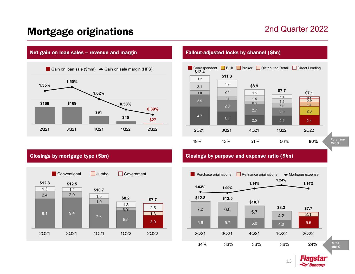 12 2nd Quarter 2022 Capacity & QualityRe ca pt ur e an d Re te nt io n Flagstar’s one-stop-shop mortgage model MORTGAGE BANKING & SERVICING Teamwork Customer Satisfaction Risk & Compliance Optimize Results Mortgage Originations Mortgage Servicing Mortgage Operations • Warehouse Lending • MSR and Servicing Advance Lending • Custodial Deposits – fund balance sheet • HELOCs Bank Synergies Sales – multi channel • TPO • Distributed Retail • Direct Lending • People • Products • CRA Secondary & Cap Markets • Pricing & Hedging • Outlets o Sales o Securitizations o Retain on B/S Performing • Growth & Scale • Customer Feedback • Risk and Compliance • Other Revenue Opportunities Default • Risk and compliance • Delinquency Mgt • Forbearance Mgt • Claims process • Minimize losses MSR Creation • Sale and retain subservicing • Retain MSR o Agency o GNMA • Protect asset Mortgage Ops • Service • Multi skilled operators • Risk and Compliance • Variable cost model • SupportSub-servicing Opportunities