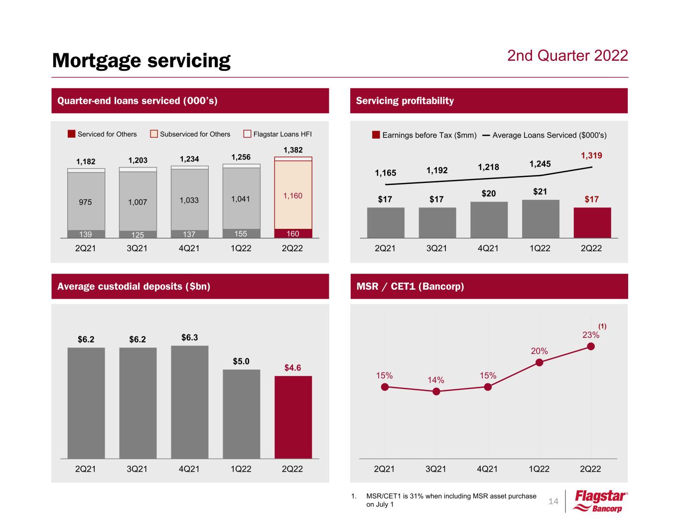 "Rising rates also helped us deliver a strong 16 percent return this quarter on our mortgage servicing rights portfolio. Additionally, we continue to grow our fee-generating servicing business as our portfolio of loans serviced or subserviced increased by 10 percent to nearly 1.4 million accounts.
