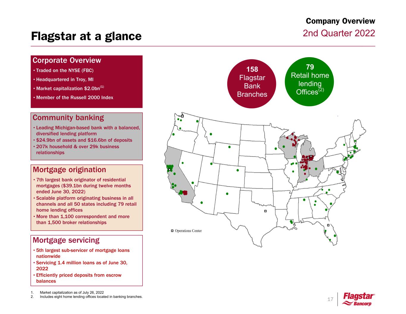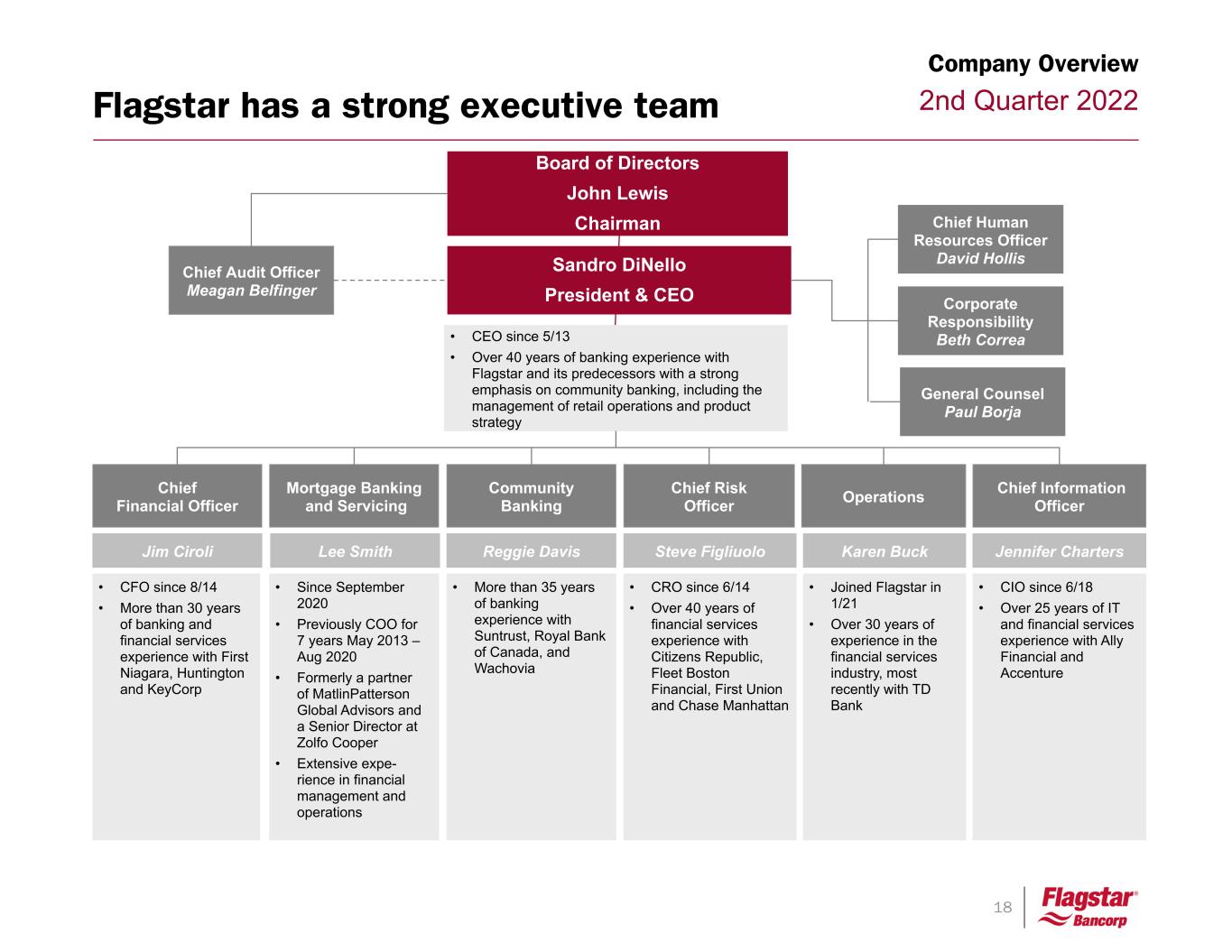 17 2nd Quarter 2022 Community banking •Leading Michigan-based bank with a balanced, diversified lending platform •$24.9bn of assets and $16.6bn of deposits •207k household & over 29k business relationships Mortgage origination •7th largest bank originator of residential mortgages ($39.1bn during twelve months ended June 30, 2022) •Scalable platform originating business in all channels and all 50 states including 79 retail home lending offices •More than 1,100 correspondent and more than 1,500 broker relationships Corporate Overview •Traded on the NYSE (FBC) •Headquartered in Troy, MI •Market capitalization $2.0bn(1) •Member of the Russell 2000 Index 1. Market capitalization as of July 26, 2022 2. Includes eight home lending offices located in banking branches. 79 Retail home lending Offices(2) 158 Flagstar Bank Branches Mortgage servicing •5th largest sub-servicer of mortgage loans nationwide •Servicing 1.4 million loans as of June 30, 2022 •Efficiently priced deposits from escrow balances Flagstar at a glance Company Overview