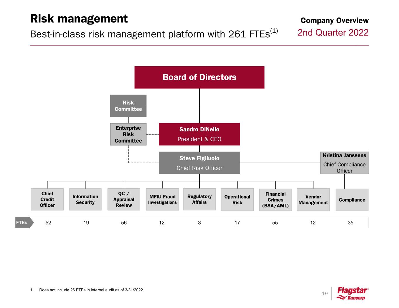18 2nd Quarter 2022Flagstar has a strong executive team Board of Directors John Lewis Chairman Community Banking Chief Financial Officer • CFO since 8/14 • More than 30 years of banking and financial services experience with First Niagara, Huntington and KeyCorp Chief Risk Officer • CRO since 6/14 • Over 40 years of financial services experience with Citizens Republic, Fleet Boston Financial, First Union and Chase Manhattan Mortgage Banking and Servicing • Since September 2020 • Previously COO for 7 years May 2013 – Aug 2020 • Formerly a partner of MatlinPatterson Global Advisors and a Senior Director at Zolfo Cooper • Extensive expe- rience in financial management and operations Operations • Joined Flagstar in 1/21 • Over 30 years of experience in the financial services industry, most recently with TD Bank • CEO since 5/13 • Over 40 years of banking experience with Flagstar and its predecessors with a strong emphasis on community banking, including the management of retail operations and product strategy Karen BuckSteve FigliuoloReggie DavisLee SmithJim Ciroli • More than 35 years of banking experience with Suntrust, Royal Bank of Canada, and Wachovia Chief Audit Officer Meagan Belfinger Sandro DiNello President & CEO Chief Information Officer Jennifer Charters • CIO since 6/18 • Over 25 years of IT and financial services experience with Ally Financial and Accenture Company Overview Chief Human Resources Officer David Hollis Corporate Responsibility Beth Correa General Counsel Paul Borja