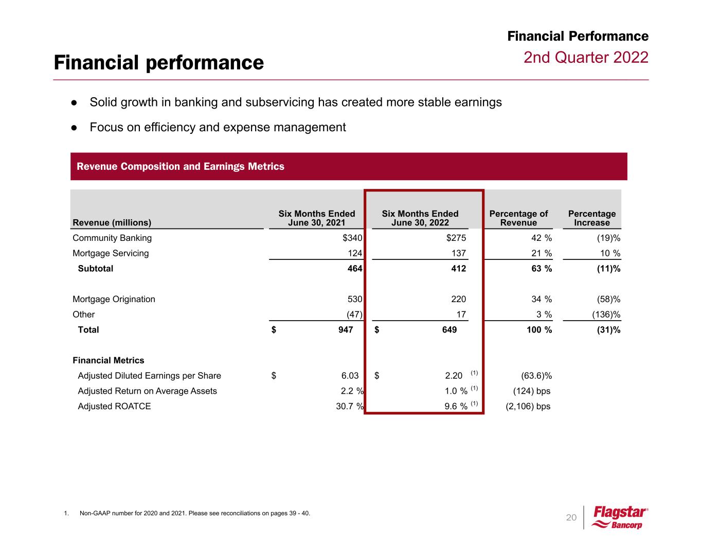 20 2nd Quarter 2022 ● Solid growth in banking and subservicing has created more stable earnings ● Focus on efficiency and expense management Revenue Composition and Earnings Metrics Financial Performance 1. Non-GAAP number for 2020 and 2021. Please see reconciliations on pages 39 - 40. Financial performance Revenue (millions) Six Months Ended June 30, 2021 Six Months Ended June 30, 2022 Percentage of Revenue Percentage Increase Community Banking $340 $275 42 % (19) % Mortgage Servicing 124 137 21 % 10 % Subtotal 464 412 63 % (11) % Mortgage Origination 530 220 34 % (58) % Other (47) 17 3 % (136) % Total $ 947 $ 649 100 % (31) % Financial Metrics Adjusted Diluted Earnings per Share $ 6.03 $ 2.20 (1) (63.6) % Adjusted Return on Average Assets 2.2 % 1.0 % (1) (124) bps Adjusted ROATCE 30.7 % 9.6 % (1) (2,106) bps