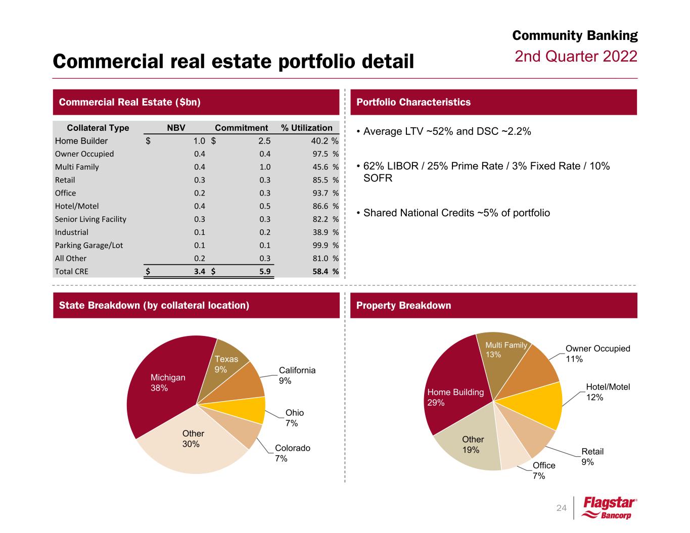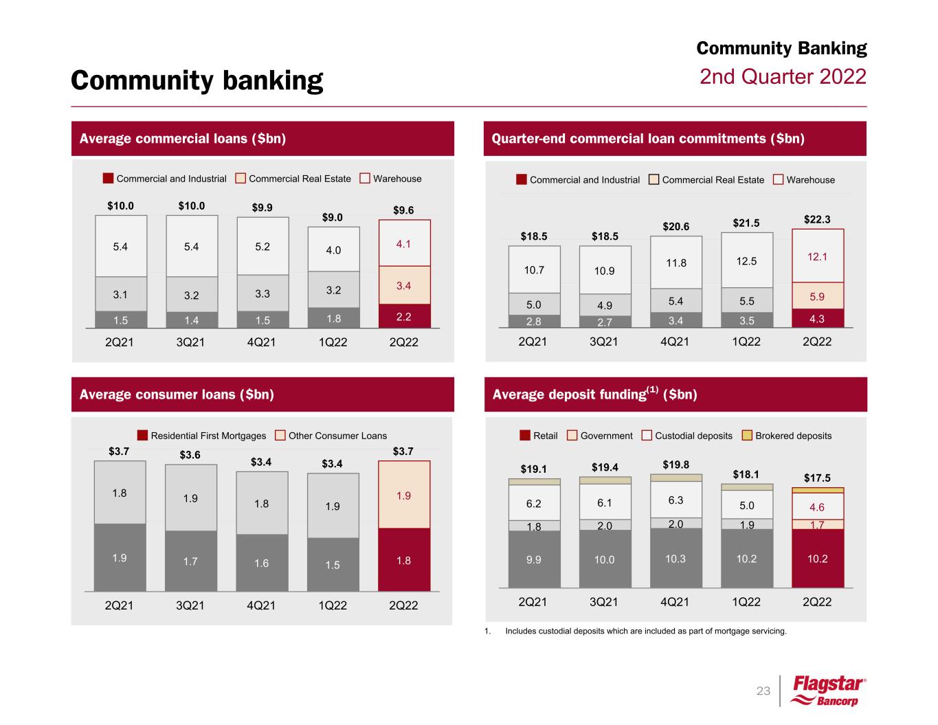 23 2nd Quarter 2022Community banking Quarter-end commercial loan commitments ($bn) Average deposit funding(1) ($bn) 1. Includes custodial deposits which are included as part of mortgage servicing. Average commercial loans ($bn) Average consumer loans ($bn) Community Banking $3.7 $3.6 $3.4 $3.4 $3.7 1.9 1.7 1.6 1.5 1.8 1.8 1.9 1.8 1.9 1.9 Residential First Mortgages Other Consumer Loans 2Q21 3Q21 4Q21 1Q22 2Q22 $19.1 $19.4 $19.8 $18.1 $17.5 9.9 10.0 10.3 10.2 10.2 1.8 2.0 2.0 1.9 1.7 6.2 6.1 6.3 5.0 4.6 Retail Government Custodial deposits Brokered deposits 2Q21 3Q21 4Q21 1Q22 2Q22 $10.0 $10.0 $9.9 $9.0 $9.6 1.5 1.4 1.5 1.8 2.2 3.1 3.2 3.3 3.2 3.4 5.4 5.4 5.2 4.0 4.1 Commercial and Industrial Commercial Real Estate Warehouse 2Q21 3Q21 4Q21 1Q22 2Q22 $18.5 $18.5 $20.6 $21.5 $22.3 2.8 2.7 3.4 3.5 4.3 5.0 4.9 5.4 5.5 5.9 10.7 10.9 11.8 12.5 12.1 Commercial and Industrial Commercial Real Estate Warehouse 2Q21 3Q21 4Q21 1Q22 2Q22