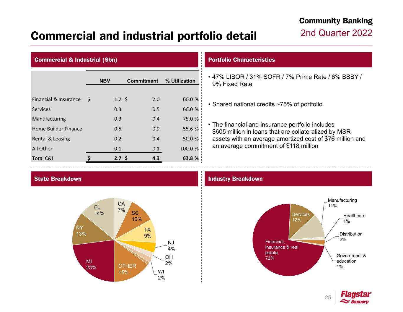 24 2nd Quarter 2022 • Average LTV ~52% and DSC ~2.2% • 62% LIBOR / 25% Prime Rate / 3% Fixed Rate / 10% SOFR • Shared National Credits ~5% of portfolio Commercial Real Estate ($bn) Commercial real estate portfolio detail Portfolio Characteristics State Breakdown (by collateral location) Community Banking Property Breakdown Collateral Type NBV Commitment % Utilization Home Builder $ 1.0 $ 2.5 40.2 % Owner Occupied 0.4 0.4 97.5 % Multi Family 0.4 1.0 45.6 % Retail 0.3 0.3 85.5 % Office 0.2 0.3 93.7 % Hotel/Motel 0.4 0.5 86.6 % Senior Living Facility 0.3 0.3 82.2 % Industrial 0.1 0.2 38.9 % Parking Garage/Lot 0.1 0.1 99.9 % All Other 0.2 0.3 81.0 % Total CRE $ 3.4 $ 5.9 58.4 % Michigan 38% Texas 9% California 9% Ohio 7% Colorado 7% Other 30% Home Building 29% Multi Family 13% Owner Occupied 11% Hotel/Motel 12% Retail 9%Office 7% Other 19%