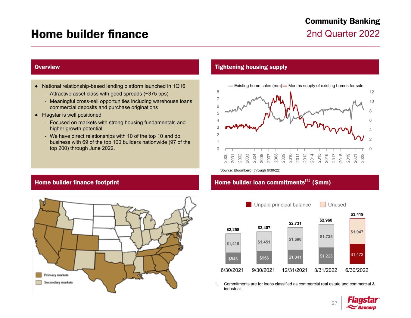 27 2nd Quarter 2022Home builder finance Community Banking Home builder loan commitments(1) ($mm) ● National relationship-based lending platform launched in 1Q16 - Attractive asset class with good spreads (~375 bps) - Meaningful cross-sell opportunities including warehouse loans, commercial deposits and purchase originations ● Flagstar is well positioned - Focused on markets with strong housing fundamentals and higher growth potential - We have direct relationships with 10 of the top 10 and do business with 69 of the top 100 builders nationwide (97 of the top 200) through June 2022. Home builder finance footprint Overview Tightening housing supply 1. Commitments are for loans classified as commercial real estate and commercial & industrial. $2,258 $2,407 $2,731 $2,960 $3,419 $843 $956 $1,041 $1,225 $1,473 $1,415 $1,451 $1,690 $1,735 $1,947 Unpaid principal balance Unused 6/30/2021 9/30/2021 12/31/2021 3/31/2022 6/30/2022 Existing home sales (mm) Months supply of existing homes for sale 20 00 20 01 20 02 20 03 20 04 20 05 20 07 20 08 20 09 20 10 20 11 20 12 20 14 20 15 20 16 20 17 20 18 20 19 20 21 20 22 0 1 2 3 4 5 6 7 8 0 2 4 6 8 10 12 Source: Bloomberg (through 6/30/22)
