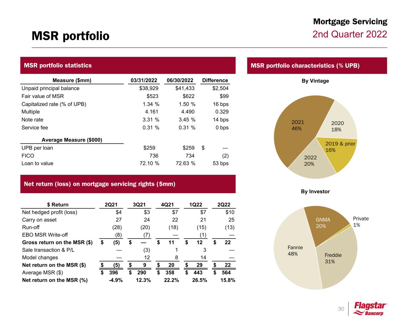 30 2nd Quarter 2022 154 7 35 MSR portfolio MSR portfolio characteristics (% UPB)MSR portfolio statistics Net return (loss) on mortgage servicing rights ($mm) Mortgage Servicing By Vintage 2022 20% 2021 46% 2020 18% 2019 & prior 16% By Investor Freddie 31% Fannie 48% GNMA 20% Private 1% Measure ($mm) 03/31/2022 06/30/2022 Difference Unpaid principal balance $38,929 $41,433 $2,504 Fair value of MSR $523 $622 $99 Capitalized rate (% of UPB) 1.34 % 1.50 % 16 bps Multiple 4.161 4.490 0.329 Note rate 3.31 % 3.45 % 14 bps Service fee 0.31 % 0.31 % 0 bps Average Measure ($000) UPB per loan $259 $259 $ — FICO 736 734 (2) Loan to value 72.10 % 72.63 % 53 bps $ Return 2Q21 3Q21 4Q21 1Q22 2Q22 Net hedged profit (loss) $4 $3 $7 $7 $10 Carry on asset 27 24 22 21 25 Run-off (28) (20) (18) (15) (13) EBO MSR Write-off (8) (7) — (1) — Gross return on the MSR ($) $ (5) $ — $ 11 $ 12 $ 22 Sale transaction & P/L — (3) 1 3 — Model changes — 12 8 14 — Net return on the MSR ($) $ (5) $ 9 $ 20 $ 29 $ 22 Average MSR ($) $ 396 $ 290 $ 358 $ 443 $ 564 Net return on the MSR (%) -4.9 % 12.3 % 22.2 % 26.5 % 15.8 %