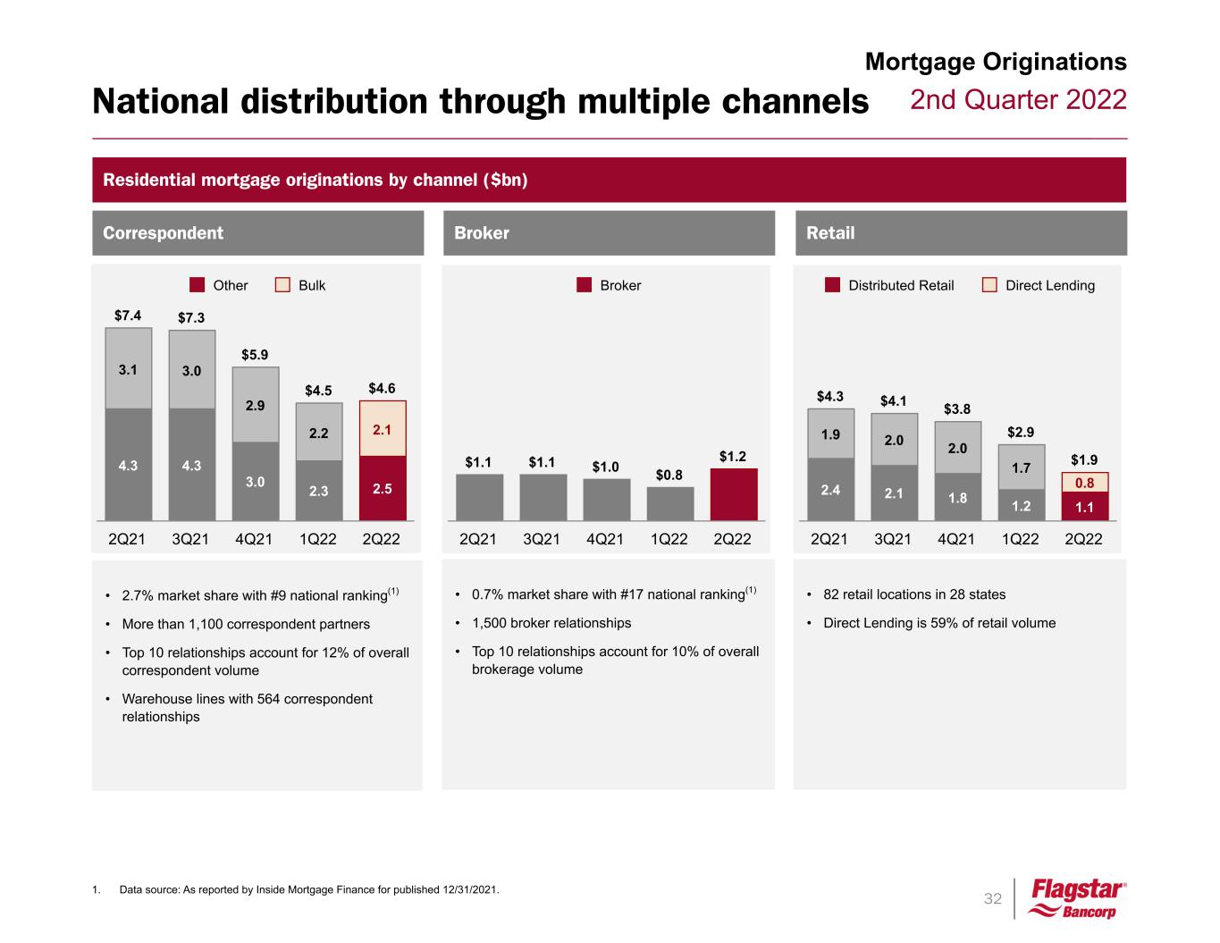 31 2nd Quarter 2022 154 7 35 Servicing Servicing Profitability Mortgage Servicing 1. Expense on custodial deposits from loans subserviced which is included in net loan administration income for GAAP purposes. Includes intersegment allocation. 2. Service fee income and late fee income are included in net loan administration income for GAAP purposes; ancillary fee income is included in loan fees and charges for GAAP purposes. 3. Includes direct allocations. ($mm) 2Q21 3Q21 4Q21 1Q22 2Q22 Net interest income Interest income (FTP) $ 5 $ 6 $ 6 $ 6 $ 9 Interest expense on custodial deposits (1) (2) (2) (2) (3) (5) Total net interest income 3 4 4 3 4 Noninterest income (2) Service fee income 36 36 42 40 39 Ancillary fee income 19 20 18 21 22 Late fee income 4 4 3 3 5 Total noninterest income 59 60 63 64 66 Noninterest expense (3) (45) (47) (48) (46) (53) Earnings before Tax $ 17 $ 17 $ 19 $ 21 $ 17 Average Custodial Deposits ($bn) $ 6.2 $ 6.3 $ 6.3 $ 5.0 $ 4.8 Average Loans Serviced for Others (000's) 1,165 1,192 1,218 1,245 1,319