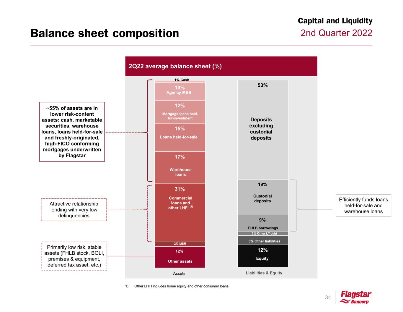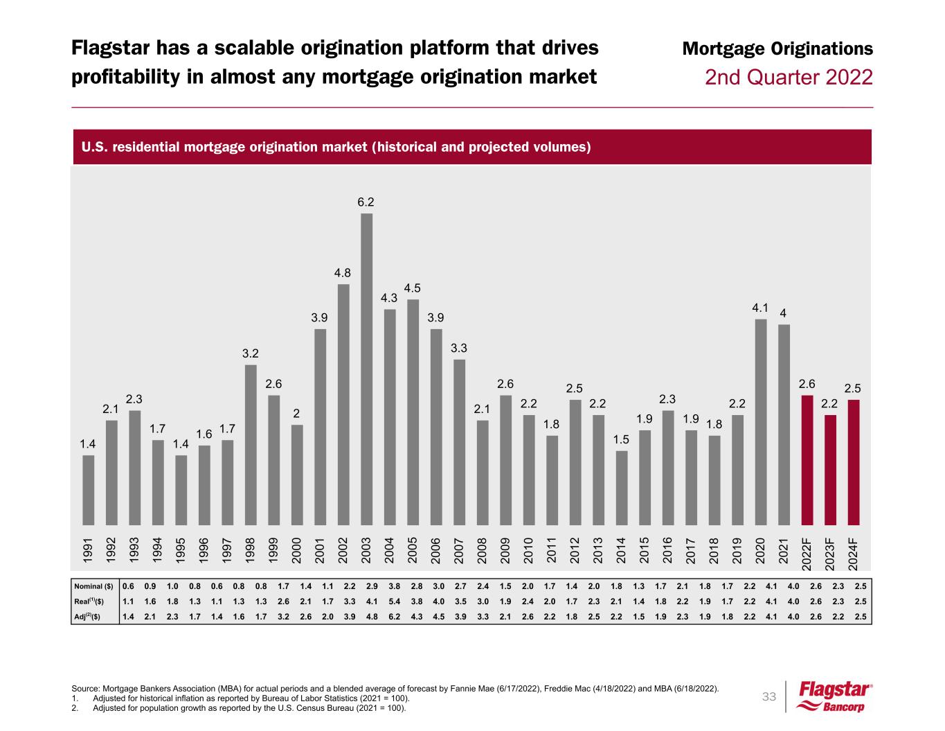 33 2nd Quarter 2022 Flagstar has a scalable origination platform that drives profitability in almost any mortgage origination market Mortgage Originations Source: Mortgage Bankers Association (MBA) for actual periods and a blended average of forecast by Fannie Mae (6/17/2022), Freddie Mac (4/18/2022) and MBA (6/18/2022). 1. Adjusted for historical inflation as reported by Bureau of Labor Statistics (2021 = 100). 2. Adjusted for population growth as reported by the U.S. Census Bureau (2021 = 100). U.S. residential mortgage origination market (historical and projected volumes) 0.6 0.9 1.0 0.8 0.6 0.8 0.8 1.7 1.4 1.1 2.2 2.9 3.8 2.8 3.0 2.7 2.4 1.5 2.0 1.7 1.4 2.0 1.8 1.3 1.7 2.1 1.8 1.7 2.2 4.1 4.0 2.6 2.3 2.5 1.1 1.6 1.8 1.3 1.1 1.3 1.3 2.6 2.1 1.7 3.3 4.1 5.4 3.8 4.0 3.5 3.0 1.9 2.4 2.0 1.7 2.3 2.1 1.4 1.8 2.2 1.9 1.7 2.2 4.1 4.0 2.6 2.3 2.5 1.4 2.1 2.3 1.7 1.4 1.6 1.7 3.2 2.6 2.0 3.9 4.8 6.2 4.3 4.5 3.9 3.3 2.1 2.6 2.2 1.8 2.5 2.2 1.5 1.9 2.3 1.9 1.8 2.2 4.1 4.0 2.6 2.2 2.5 Nominal ($) Real(1)($) Adj(2)($) 1.4 2.1 2.3 1.7 1.4 1.6 1.7 3.2 2.6 2 3.9 4.8 6.2 4.3 4.5 3.9 3.3 2.1 2.6 2.2 1.8 2.5 2.2 1.5 1.9 2.3 1.9 1.8 2.2 4.1 4 2.6 2.2 2.5 19 91 19 92 19 93 19 94 19 95 19 96 19 97 19 98 19 99 20 00 20 01 20 02 20 03 20 04 20 05 20 06 20 07 20 08 20 09 20 10 20 11 20 12 20 13 20 14 20 15 20 16 20 17 20 18 20 19 20 20 20 21 20 22 F 20 23 F 20 24 F