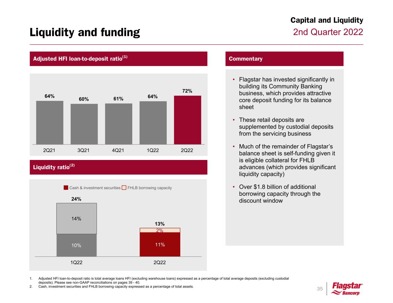 35 2nd Quarter 2022Liquidity and funding 154 7 35 1. Adjusted HFI loan-to-deposit ratio is total average loans HFI (excluding warehouse loans) expressed as a percentage of total average deposits (excluding custodial deposits). Please see non-GAAP reconciliations on pages 39 - 40. 2. Cash, investment securities and FHLB borrowing capacity expressed as a percentage of total assets. Adjusted HFI loan-to-deposit ratio(1) Commentary • Flagstar has invested significantly in building its Community Banking business, which provides attractive core deposit funding for its balance sheet • These retail deposits are supplemented by custodial deposits from the servicing business • Much of the remainder of Flagstar’s balance sheet is self-funding given it is eligible collateral for FHLB advances (which provides significant liquidity capacity) • Over $1.8 billion of additional borrowing capacity through the discount window Liquidity ratio(2) Capital and Liquidity 64% 60% 61% 64% 72% 2Q21 3Q21 4Q21 1Q22 2Q22 24% 13% 10% 11% 14% 2% Cash & investment securities FHLB borrowing capacity 1Q22 2Q22