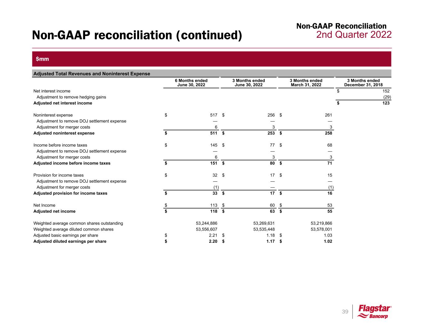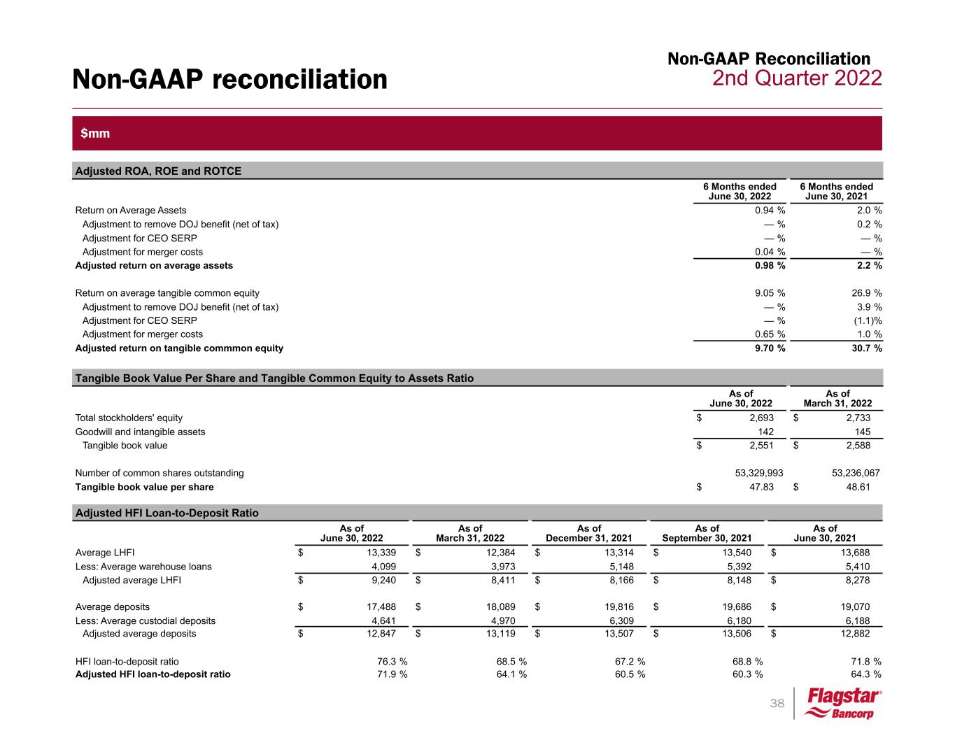 38 2nd Quarter 2022Non-GAAP reconciliation Non-GAAP Reconciliation $mm Adjusted ROA, ROE and ROTCE 6 Months ended June 30, 2022 6 Months ended June 30, 2021 Return on Average Assets 0.94 % 2.0 % Adjustment to remove DOJ benefit (net of tax) — % 0.2 % Adjustment for CEO SERP — % — % Adjustment for merger costs 0.04 % — % Adjusted return on average assets 0.98 % 2.2 % Return on average tangible common equity 9.05 % 26.9 % Adjustment to remove DOJ benefit (net of tax) — % 3.9 % Adjustment for CEO SERP — % (1.1) % Adjustment for merger costs 0.65 % 1.0 % Adjusted return on tangible commmon equity 9.70 % 30.7 % Tangible Book Value Per Share and Tangible Common Equity to Assets Ratio As of June 30, 2022 As of March 31, 2022 Total stockholders' equity $ 2,693 $ 2,733 Goodwill and intangible assets 142 145 Tangible book value $ 2,551 $ 2,588 Number of common shares outstanding 53,329,993 53,236,067 Tangible book value per share $ 47.83 $ 48.61 Adjusted HFI Loan-to-Deposit Ratio As of June 30, 2022 As of March 31, 2022 As of December 31, 2021 As of September 30, 2021 As of June 30, 2021 Average LHFI $ 13,339 $ 12,384 $ 13,314 $ 13,540 $ 13,688 Less: Average warehouse loans 4,099 3,973 5,148 5,392 5,410 Adjusted average LHFI $ 9,240 $ 8,411 $ 8,166 $ 8,148 $ 8,278 Average deposits $ 17,488 $ 18,089 $ 19,816 $ 19,686 $ 19,070 Less: Average custodial deposits 4,641 4,970 6,309 6,180 6,188 Adjusted average deposits $ 12,847 $ 13,119 $ 13,507 $ 13,506 $ 12,882 HFI loan-to-deposit ratio 76.3 % 68.5 % 67.2 % 68.8 % 71.8 % Adjusted HFI loan-to-deposit ratio 71.9 % 64.1 % 60.5 % 60.3 % 64.3 %