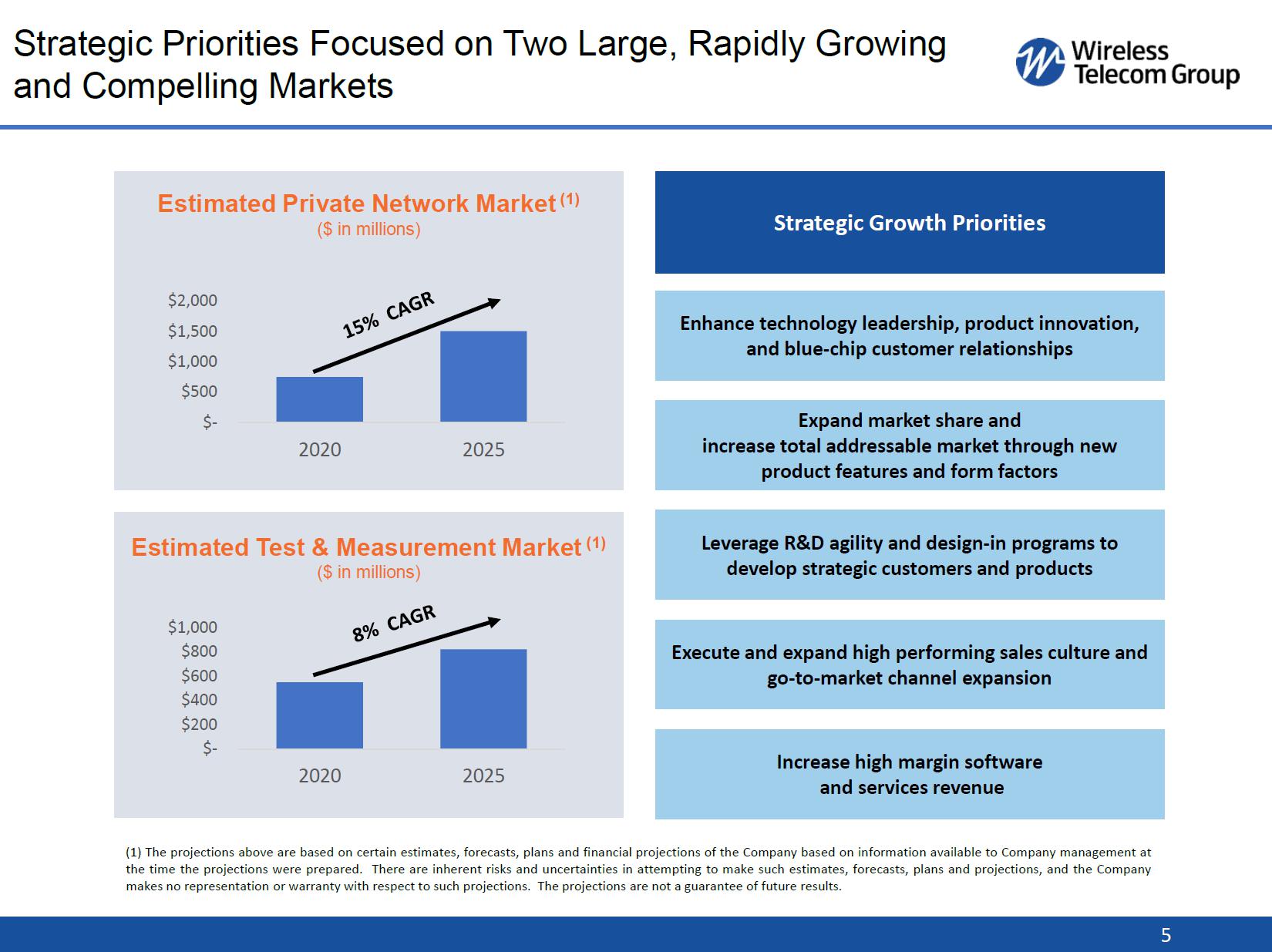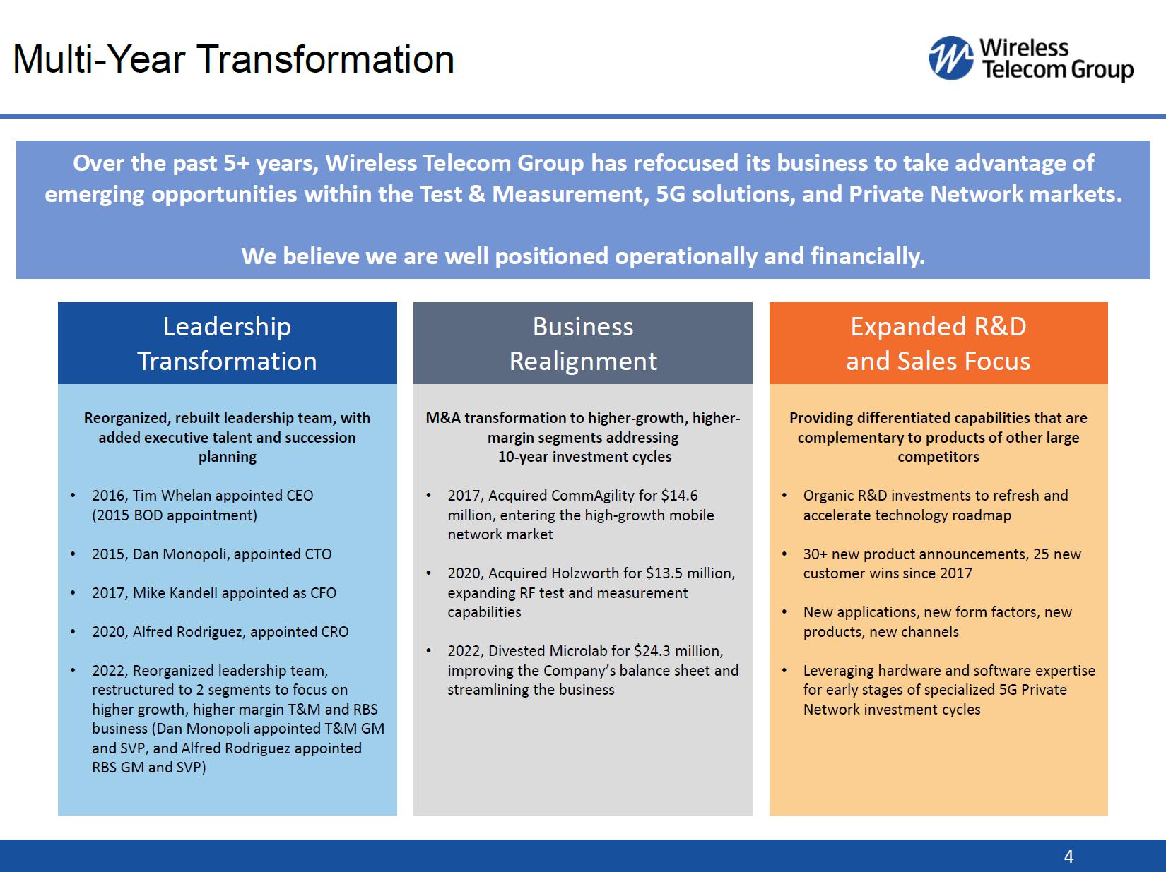 Tim Whelan, CEO of Wireless Telecom Group, Inc. stated, “Over the past five years, we have refocused our business to take advantage of emerging opportunities underway within the Test & Measurement markets, and private network markets which include compelling growth opportunities in satellite communications, 5G investments, semiconductor investments and quantum computing growth. As a result, we have transformed our leadership team, realigned our business, and expanded our R&D and sales focus. Today’s announcement is the progression of our long-term strategic growth plan. While we remain confident in the direction we are headed and our future opportunities, we have decided to conduct a strategic review and explore options to accelerate the realization of value for our shareholders.”