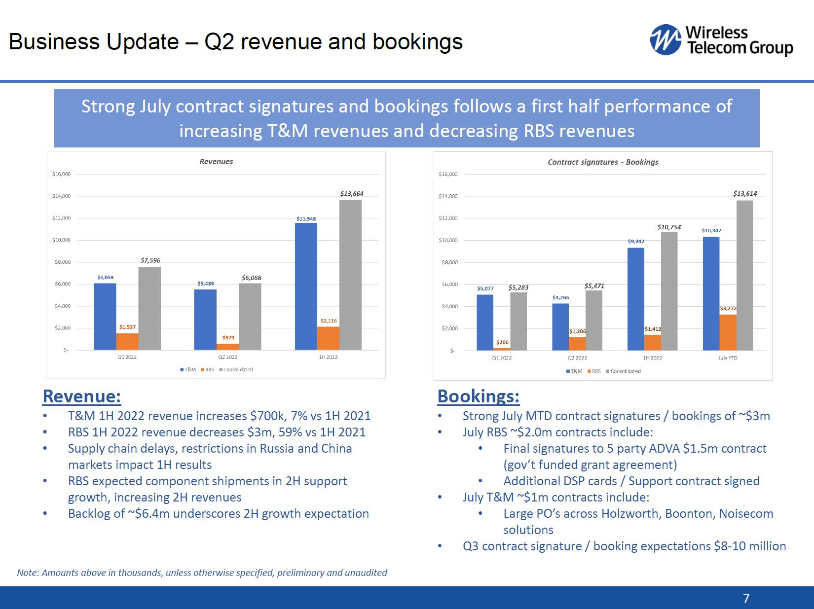 Wireless Telecom Group has received strong bookings and contract signatures in the month of July of approximately $3.0 million and expects bookings and contract signatures in the 3rd quarter to total between $8 million and $10 million. These include $2.0 million of new RBS contracts which includes a previously announced five party ADVA contract, a new support contract, and additional hardware card orders. The Company also received new T&M orders across all of its Holzworth, Boonton, and Noisecom solutions.