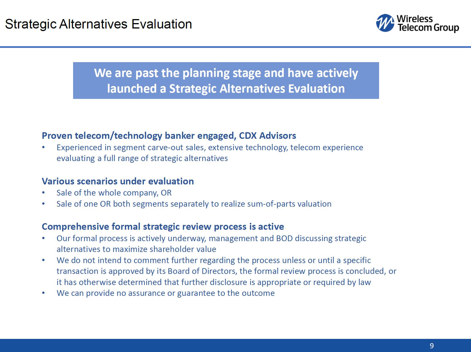 As part of Wireless Telecom Group’s strategic update, the Company has engaged an investment banking firm to explore a full range of strategic alternatives for the Company. This process is focused on enhancing value for stockholders, including, but not limited to, a transaction that sells the whole company, or separate transactions that sell each of the Company’s two segments separately to realize sum-of-parts valuation. CDX Advisors, an investment bank with deep domain expertise across the technology, media, and telecom (TMT) sectors, has been engaged to assist in the strategic alternatives process.