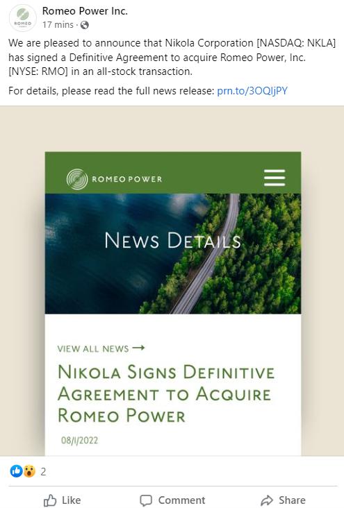LinkedIn: We are pleased to announce that Nikola Corporation [NASDAQ: NKLA] has signed a Definitive Agreement to acquire Romeo Power, Inc. [NYSE: RMO] in an all-stock transaction. For details, please read the full news release: prn.to/3OQIjPY.