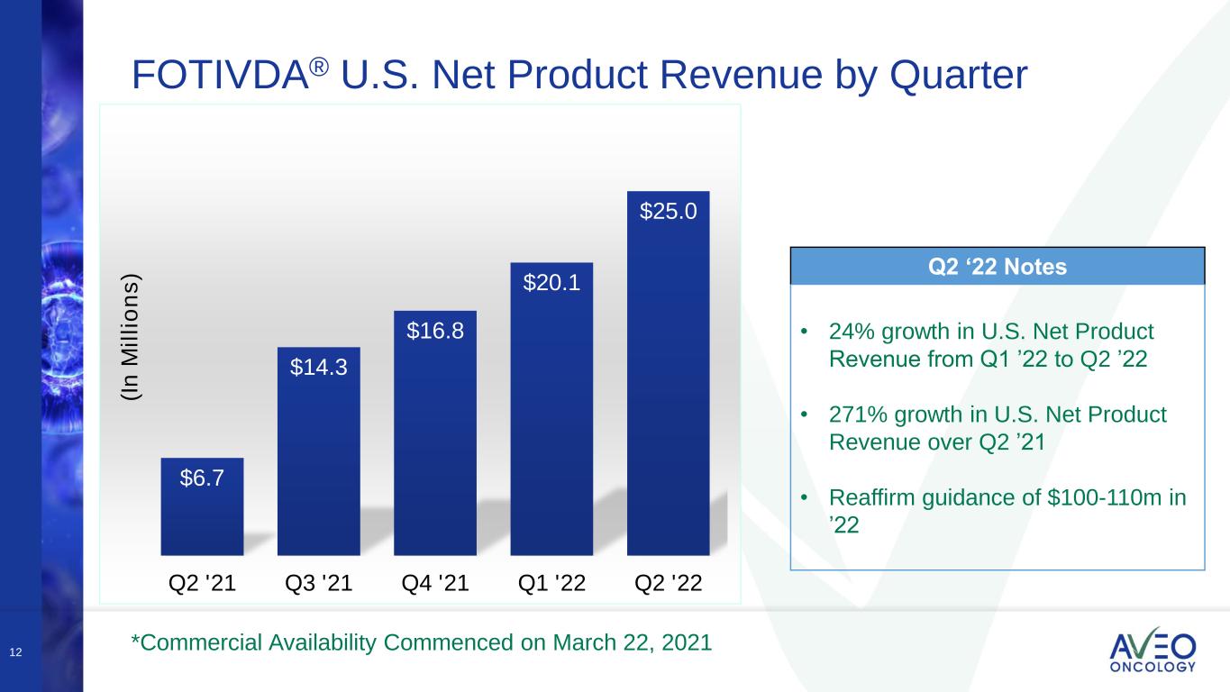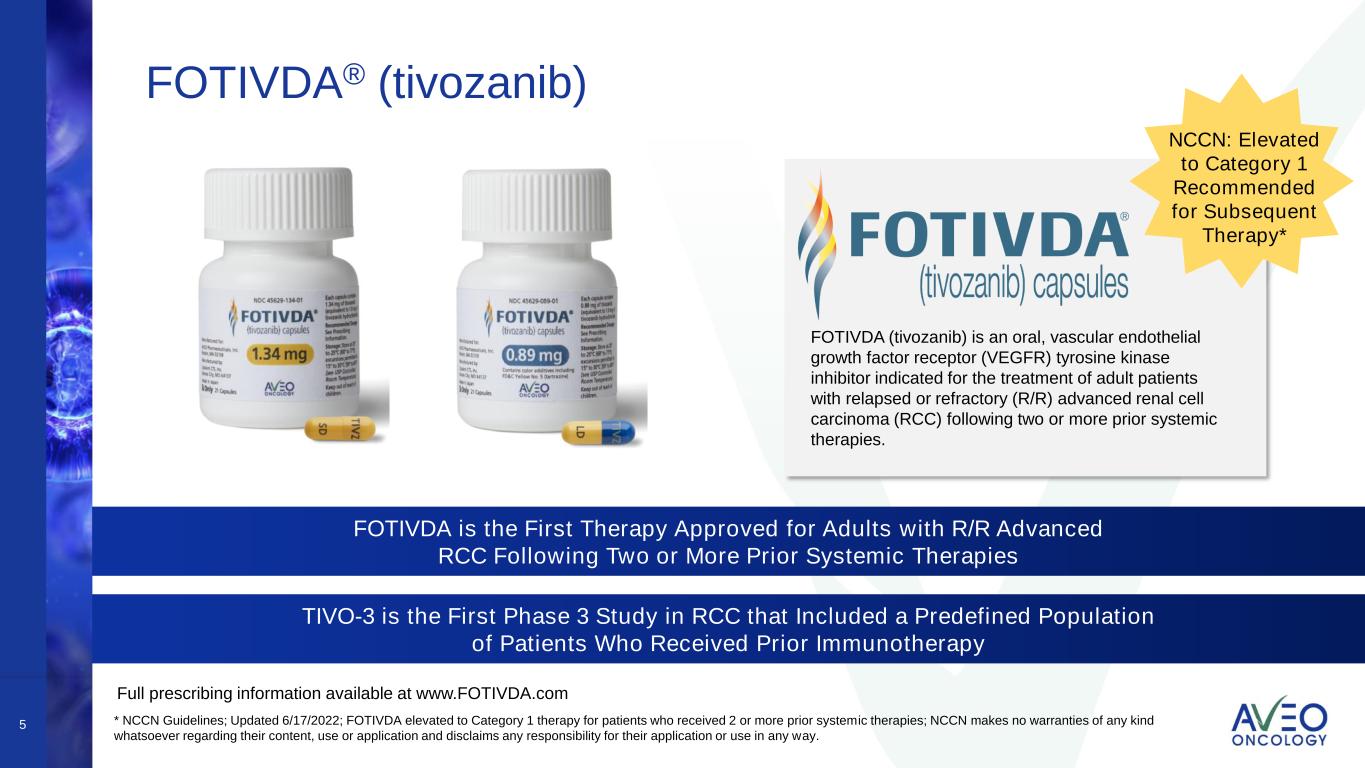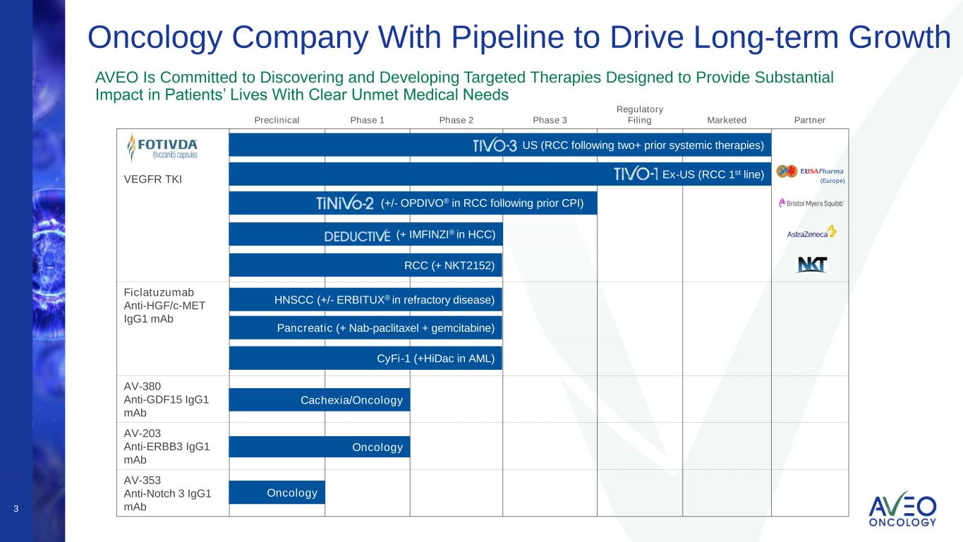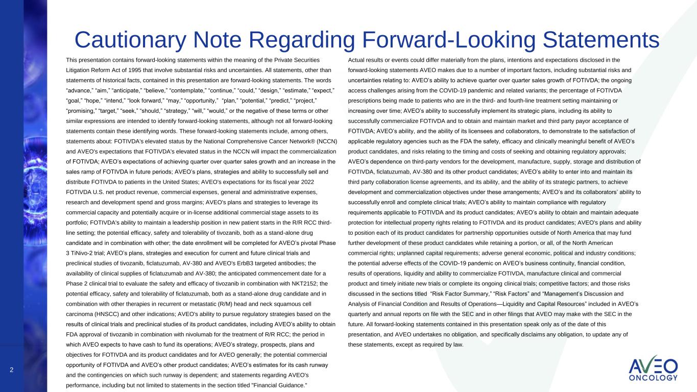 Cautionary Note Regarding Forward-Looking Statements This presentation contains forward-looking statements within the meaning of the Private Securities Litigation Reform Act of 1995 that involve substantial risks and uncertainties. All statements, other than statements of historical facts, contained in this presentation are forward-looking statements. The words “advance,” “aim,” “anticipate,” “believe,” “contemplate,” “continue,” “could,” “design,” “estimate,” “expect,” “goal,” “hope,” “intend,” “look forward,” “may,” “opportunity,” “plan,” “potential,” “predict,” “project,” “promising,” “target,” “seek,” “should,” “strategy,” “will,” “would,” or the negative of these terms or other similar expressions are intended to identify forward-looking statements, although not all forward-looking statements contain these identifying words. These forward-looking statements include, among others, statements about: FOTIVDA's elevated status by the National Comprehensive Cancer Network® (NCCN) and AVEO's expectations that FOTIVDA's elevated status in the NCCN will impact the commercialization of FOTIVDA; AVEO’s expectations of achieving quarter over quarter sales growth and an increase in the sales ramp of FOTIVDA in future periods; AVEO’s plans, strategies and ability to successfully sell and distribute FOTIVDA to patients in the United States; AVEO's expectations for its fiscal year 2022 FOTIVDA U.S. net product revenue, commercial expenses, general and administrative expenses, research and development spend and gross margins; AVEO's plans and strategies to leverage its commercial capacity and potentially acquire or in-license additional commercial stage assets to its portfolio; FOTIVDA's ability to maintain a leadership position in new patient starts in the R/R RCC third- line setting; the potential efficacy, safety and tolerability of tivozanib, both as a stand-alone drug candidate and in combination with other; the date enrollment will be completed for AVEO’s pivotal Phase 3 TiNivo-2 trial; AVEO’s plans, strategies and execution for current and future clinical trials and preclinical studies of tivozanib, ficlatuzumab, AV-380 and AVEO's ErbB3 targeted antibodies; the availability of clinical supplies of ficlatuzumab and AV-380; the anticipated commencement date for a Phase 2 clinical trial to evaluate the safety and efficacy of tivozanib in combination with NKT2152; the potential efficacy, safety and tolerability of ficlatuzumab, both as a stand-alone drug candidate and in combination with other therapies in recurrent or metastatic (R/M) head and neck squamous cell carcinoma (HNSCC) and other indications; AVEO's ability to pursue regulatory strategies based on the results of clinical trials and preclinical studies of its product candidates, including AVEO’s ability to obtain FDA approval of tivozanib in combination with nivolumab for the treatment of R/R RCC; the period in which AVEO expects to have cash to fund its operations; AVEO’s strategy, prospects, plans and objectives for FOTIVDA and its product candidates and for AVEO generally; the potential commercial opportunity of FOTIVDA and AVEO’s other product candidates; AVEO’s estimates for its cash runway and the contingencies on which such runway is dependent; and statements regarding AVEO's performance, including but not limited to statements in the section titled "Financial Guidance." Actual results or events could differ materially from the plans, intentions and expectations disclosed in the forward-looking statements AVEO makes due to a number of important factors, including substantial risks and uncertainties relating to: AVEO’s ability to achieve quarter over quarter sales growth of FOTIVDA; the ongoing access challenges arising from the COVID-19 pandemic and related variants; the percentage of FOTIVDA prescriptions being made to patients who are in the third- and fourth-line treatment setting maintaining or increasing over time; AVEO’s ability to successfully implement its strategic plans, including its ability to successfully commercialize FOTIVDA and to obtain and maintain market and third party payor acceptance of FOTIVDA; AVEO’s ability, and the ability of its licensees and collaborators, to demonstrate to the satisfaction of applicable regulatory agencies such as the FDA the safety, efficacy and clinically meaningful benefit of AVEO’s product candidates, and risks relating to the timing and costs of seeking and obtaining regulatory approvals; AVEO’s dependence on third-party vendors for the development, manufacture, supply, storage and distribution of FOTIVDA, ficlatuzumab, AV-380 and its other product candidates; AVEO’s ability to enter into and maintain its third party collaboration license agreements, and its ability, and the ability of its strategic partners, to achieve development and commercialization objectives under these arrangements; AVEO’s and its collaborators’ ability to successfully enroll and complete clinical trials; AVEO’s ability to maintain compliance with regulatory requirements applicable to FOTIVDA and its product candidates; AVEO’s ability to obtain and maintain adequate protection for intellectual property rights relating to FOTIVDA and its product candidates; AVEO's plans and ability to position each of its product candidates for partnership opportunities outside of North America that may fund further development of these product candidates while retaining a portion, or all, of the North American commercial rights; unplanned capital requirements; adverse general economic, political and industry conditions; the potential adverse effects of the COVID-19 pandemic on AVEO’s business continuity, financial condition, results of operations, liquidity and ability to commercialize FOTIVDA, manufacture clinical and commercial product and timely initiate new trials or comple