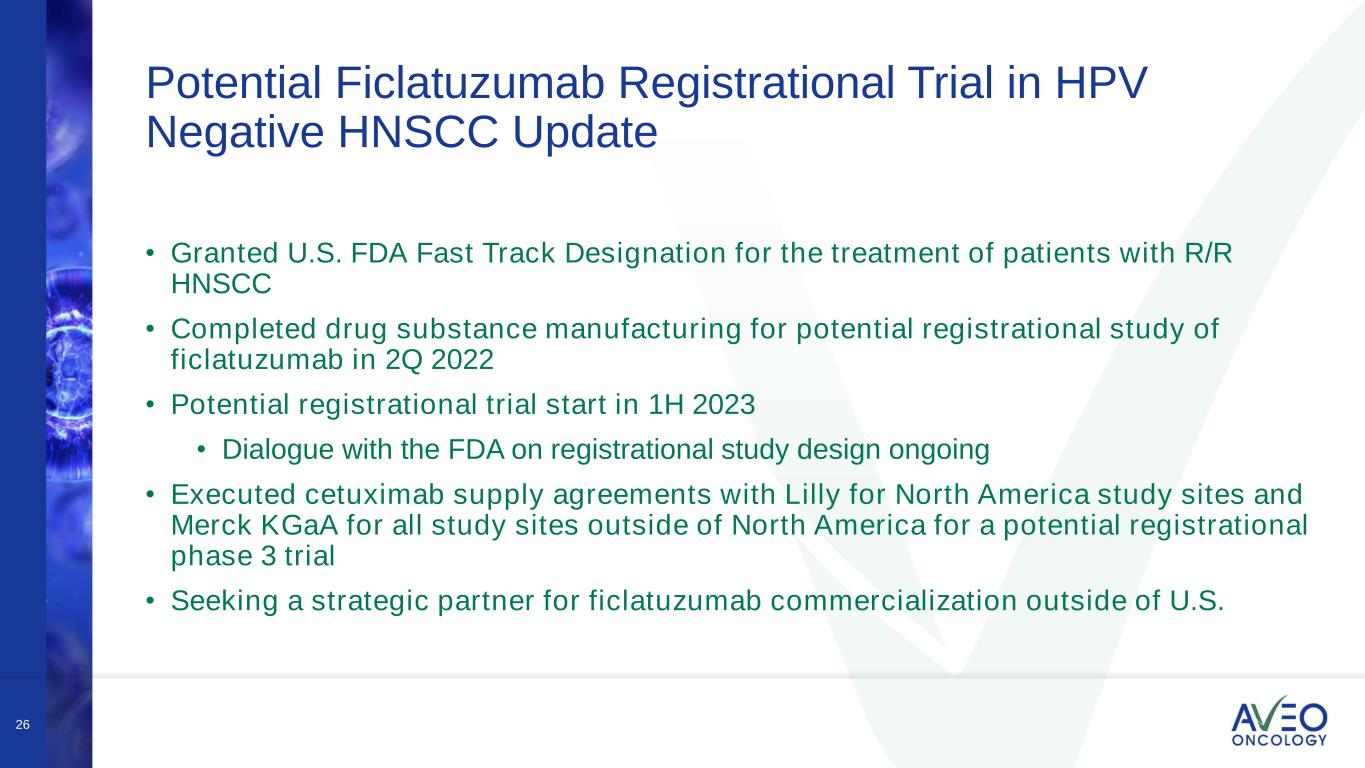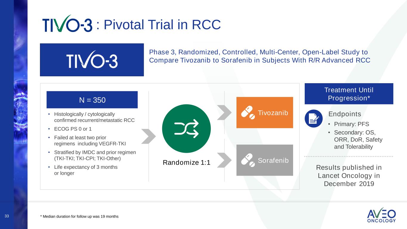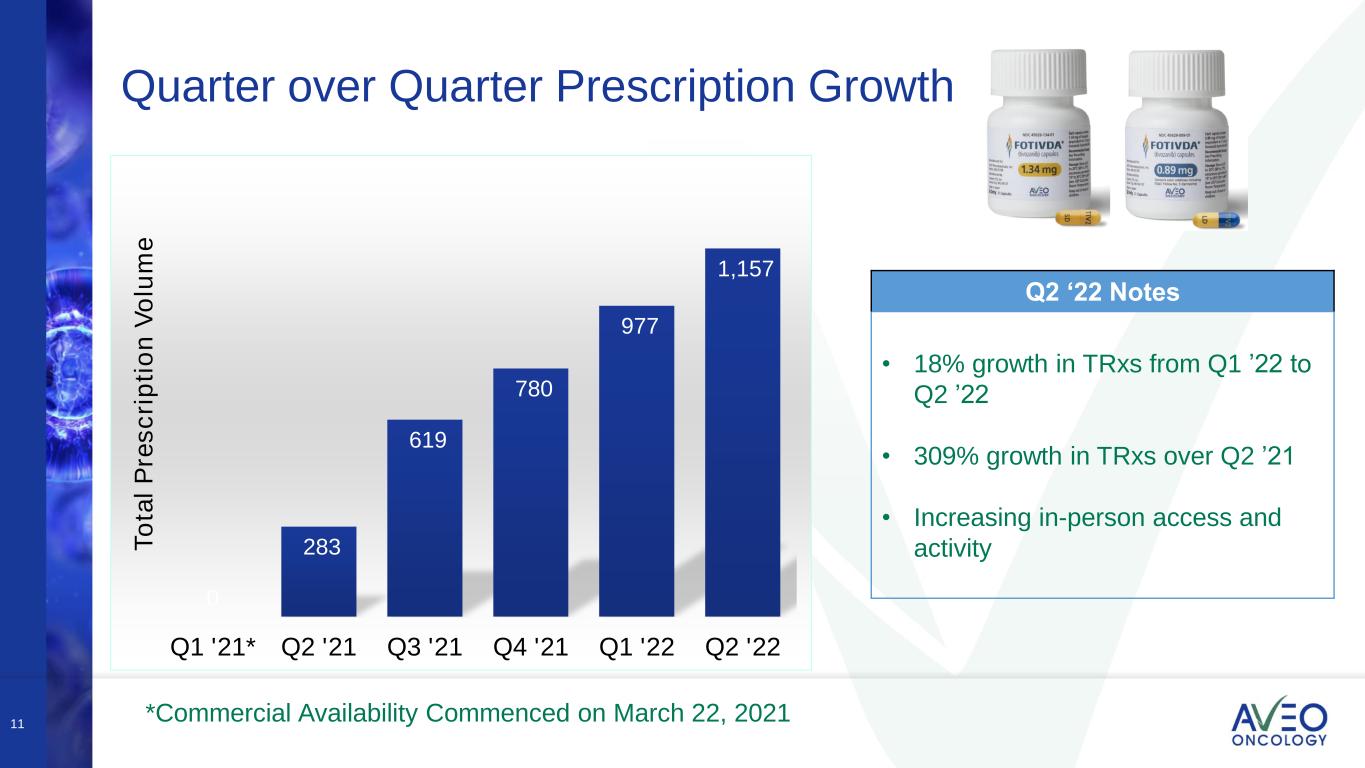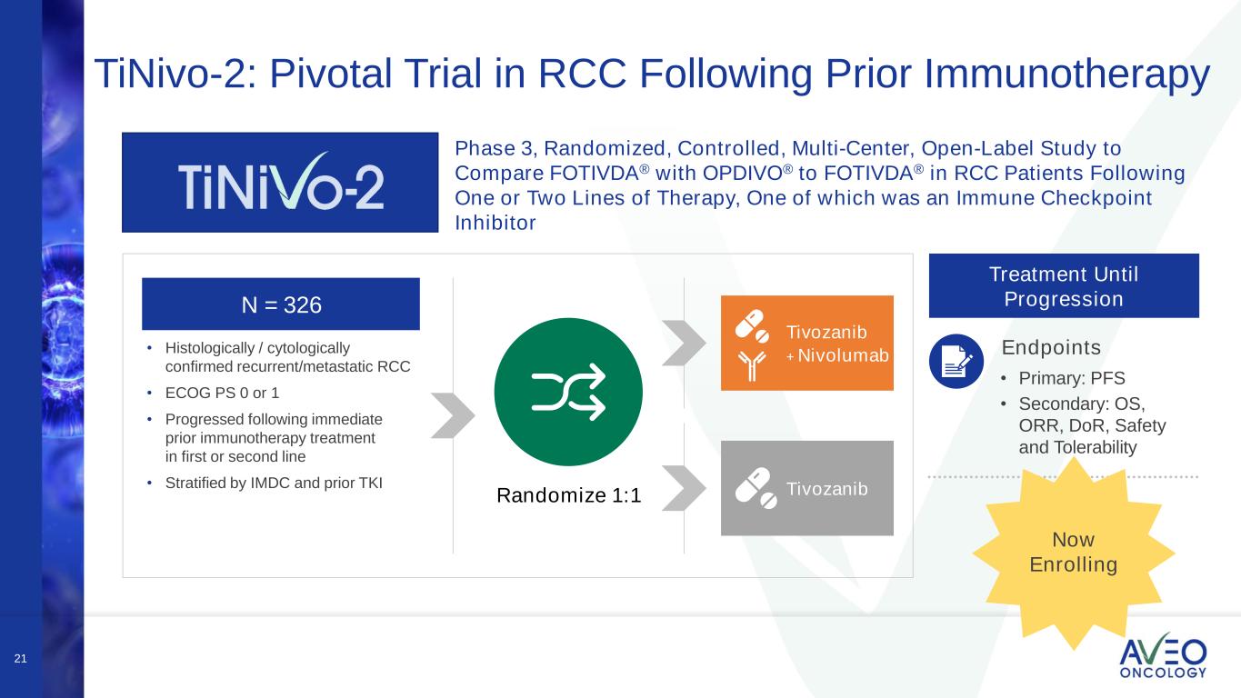 Cautionary Note Regarding Forward-Looking Statements This presentation contains forward-looking statements within the meaning of the Private Securities Litigation Reform Act of 1995 that involve substantial risks and uncertainties. All statements, other than statements of historical facts, contained in this presentation are forward-looking statements. The words “advance,” “aim,” “anticipate,” “believe,” “contemplate,” “continue,” “could,” “design,” “estimate,” “expect,” “goal,” “hope,” “intend,” “look forward,” “may,” “opportunity,” “plan,” “potential,” “predict,” “project,” “promising,” “target,” “seek,” “should,” “strategy,” “will,” “would,” or the negative of these terms or other similar expressions are intended to identify forward-looking statements, although not all forward-looking statements contain these identifying words. These forward-looking statements include, among others, statements about: FOTIVDA's elevated status by the National Comprehensive Cancer Network® (NCCN) and AVEO's expectations that FOTIVDA's elevated status in the NCCN will impact the commercialization of FOTIVDA; AVEO’s expectations of achieving quarter over quarter sales growth and an increase in the sales ramp of FOTIVDA in future periods; AVEO’s plans, strategies and ability to successfully sell and distribute FOTIVDA to patients in the United States; AVEO's expectations for its fiscal year 2022 FOTIVDA U.S. net product revenue, commercial expenses, general and administrative expenses, research and development spend and gross margins; AVEO's plans and strategies to leverage its commercial capacity and potentially acquire or in-license additional commercial stage assets to its portfolio; FOTIVDA's ability to maintain a leadership position in new patient starts in the R/R RCC third- line setting; the potential efficacy, safety and tolerability of tivozanib, both as a stand-alone drug candidate and in combination with other; the date enrollment will be completed for AVEO’s pivotal Phase 3 TiNivo-2 trial; AVEO’s plans, strategies and execution for current and future clinical trials and preclinical studies of tivozanib, ficlatuzumab, AV-380 and AVEO's ErbB3 targeted antibodies; the availability of clinical supplies of ficlatuzumab and AV-380; the anticipated commencement date for a Phase 2 clinical trial to evaluate the safety and efficacy of tivozanib in combination with NKT2152; the potential efficacy, safety and tolerability of ficlatuzumab, both as a stand-alone drug candidate and in combination with other therapies in recurrent or metastatic (R/M) head and neck squamous cell carcinoma (HNSCC) and other indications; AVEO's ability to pursue regulatory strategies based on the results of clinical trials and preclinical studies of its product candidates, including AVEO’s ability to obtain FDA approval of tivozanib in combination with nivolumab for the treatment of R/R RCC; the period in which AVEO expects to have cash to fund its operations; AVEO’s strategy, prospects, plans and objectives for FOTIVDA and its product candidates and for AVEO generally; the potential commercial opportunity of FOTIVDA and AVEO’s other product candidates; AVEO’s estimates for its cash runway and the contingencies on which such runway is dependent; and statements regarding AVEO's performance, including but not limited to statements in the section titled "Financial Guidance." Actual results or events could differ materially from the plans, intentions and expectations disclosed in the forward-looking statements AVEO makes due to a number of important factors, including substantial risks and uncertainties relating to: AVEO’s ability to achieve quarter over quarter sales growth of FOTIVDA; the ongoing access challenges arising from the COVID-19 pandemic and related variants; the percentage of FOTIVDA prescriptions being made to patients who are in the third- and fourth-line treatment setting maintaining or increasing over time; AVEO’s ability to successfully implement its strategic plans, including its ability to successfully commercialize FOTIVDA and to obtain and maintain market and third party payor acceptance of FOTIVDA; AVEO’s ability, and the ability of its licensees and collaborators, to demonstrate to the satisfaction of applicable regulatory agencies such as the FDA the safety, efficacy and clinically meaningful benefit of AVEO’s product candidates, and risks relating to the timing and costs of seeking and obtaining regulatory approvals; AVEO’s dependence on third-party vendors for the development, manufacture, supply, storage and distribution of FOTIVDA, ficlatuzumab, AV-380 and its other product candidates; AVEO’s ability to enter into and maintain its third party collaboration license agreements, and its ability, and the ability of its strategic partners, to achieve development and commercialization objectives under these arrangements; AVEO’s and its collaborators’ ability to successfully enroll and complete clinical trials; AVEO’s ability to maintain compliance with regulatory requirements applicable to FOTIVDA and its product candidates; AVEO’s ability to obtain and maintain adequate protection for intellectual property rights relating to FOTIVDA and its product candidates; AVEO's plans and ability to position each of its product candidates for partnership opportunities outside of North America that may fund further development of these product candidates while retaining a portion, or all, of the North American commercial rights; unplanned capital requirements; adverse general economic, political and industry conditions; the potential adverse effects of the COVID-19 pandemic on AVEO’s business continuity, financial condition, results of operations, liquidity and ability to commercialize FOTIVDA, manufacture clinical and commercial product and timely initiate new trials or comple