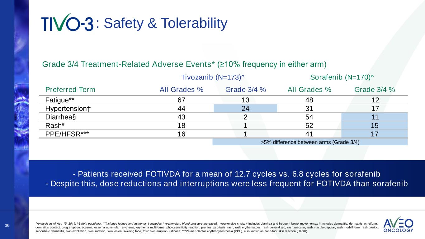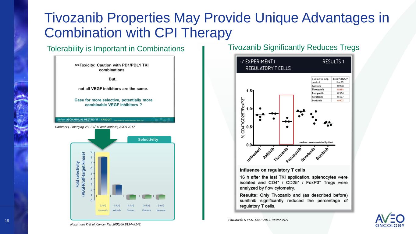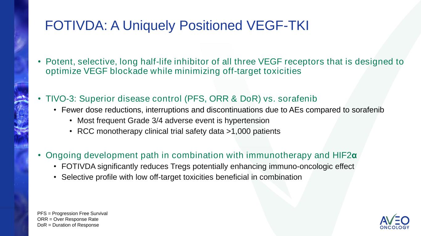 FOTIVDA: A Uniquely Positioned VEGF-TKI • Potent, selective, long half-life inhibitor of all three VEGF receptors that is designed to optimize VEGF blockade while minimizing off-target toxicities • TIVO-3: Superior disease control (PFS, ORR & DoR) vs. sorafenib • Fewer dose reductions, interruptions and discontinuations due to AEs compared to sorafenib • Most frequent Grade 3/4 adverse event is hypertension • RCC monotherapy clinical trial safety data >1,000 patients • Ongoing development path in combination with immunotherapy and HIF2α • FOTIVDA significantly reduces Tregs potentially enhancing immuno-oncologic effect • Selective profile with low off-target toxicities beneficial in combination PFS = Progression Free Survival ORR = Over Response Rate DoR = Duration of Response