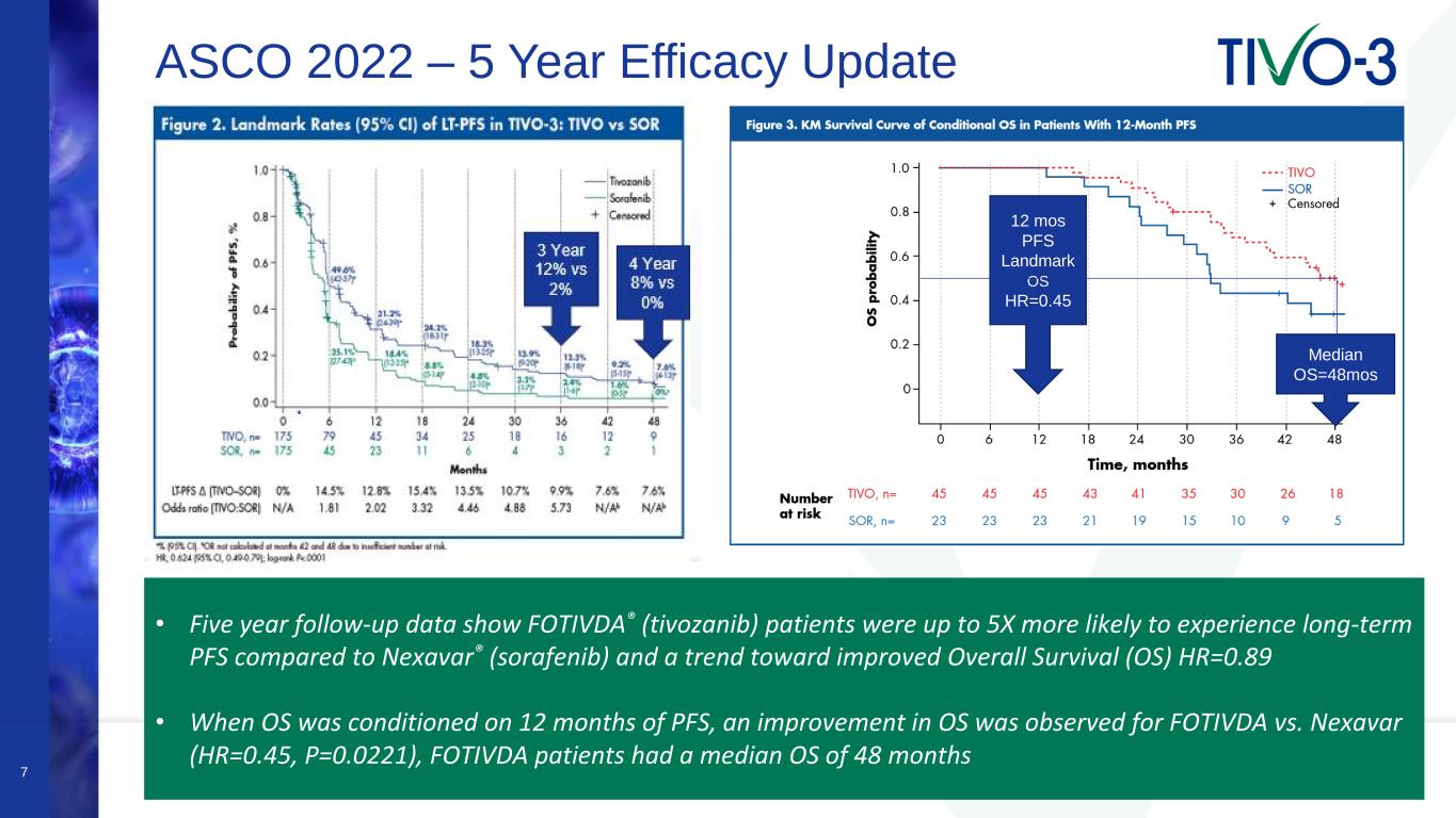 7 ASCO 2022 – 5 Year Efficacy Update • Five year follow-up data show FOTIVDA® (tivozanib) patients were up to 5X more likely to experience long-term PFS compared to Nexavar® (sorafenib) and a trend toward improved Overall Survival (OS) HR=0.89 • When OS was conditioned on 12 months of PFS, an improvement in OS was observed for FOTIVDA vs. Nexavar (HR=0.45, P=0.0221), FOTIVDA patients had a median OS of 48 months 12 mos PFS Landmark OS HR=0.45 Median OS=48mos