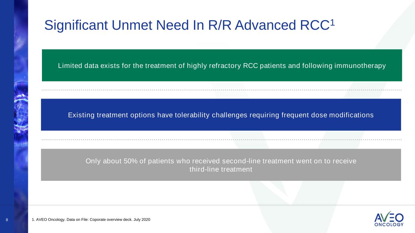 Significant Unmet Need In R/R Advanced RCC1 Limited data exists for the treatment of highly refractory RCC patients and following immunotherapy Existing treatment options have tolerability challenges requiring frequent dose modifications Only about 50% of patients who received second-line treatment went on to receive third-line treatment 8 1. AVEO Oncology. Data on File: Coporate overview deck. July 2020