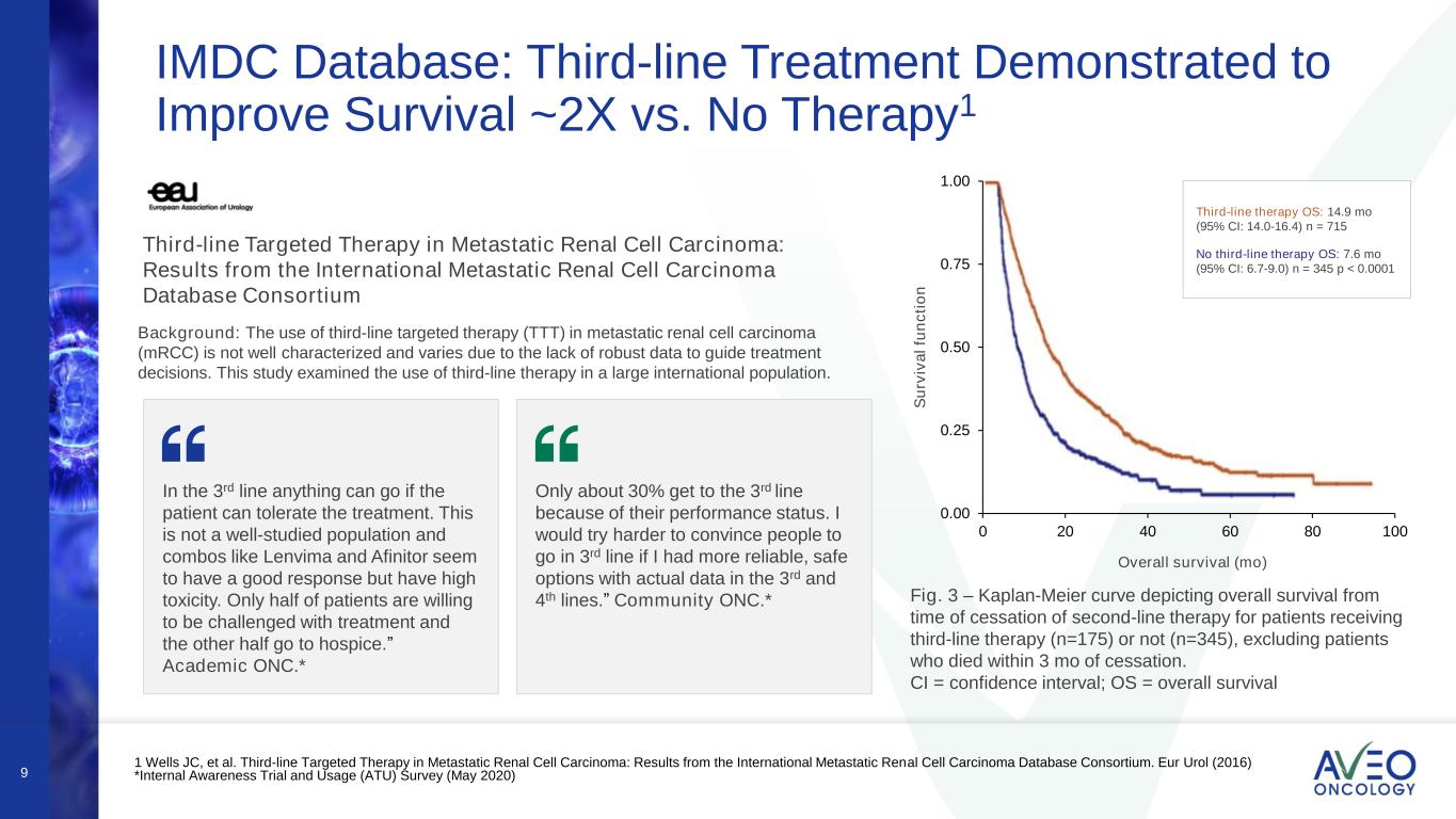 0.00 0.25 0.50 0.75 1.00 0 20 40 60 80 100 IMDC Database: Third-line Treatment Demonstrated to Improve Survival ~2X vs. No Therapy1 9 ** 1 Wells JC, et al. Third-line Targeted Therapy in Metastatic Renal Cell Carcinoma: Results from the International Metastatic Renal Cell Carcinoma Database Consortium. Eur Urol (2016) *Internal Awareness Trial and Usage (ATU) Survey (May 2020) Third-line Targeted Therapy in Metastatic Renal Cell Carcinoma: Results from the International Metastatic Renal Cell Carcinoma Database Consortium Background: The use of third-line targeted therapy (TTT) in metastatic renal cell carcinoma (mRCC) is not well characterized and varies due to the lack of robust data to guide treatment decisions. This study examined the use of third-line therapy in a large international population. In the 3rd line anything can go if the patient can tolerate the treatment. This is not a well-studied population and combos like Lenvima and Afinitor seem to have a good response but have high toxicity. Only half of patients are willing to be challenged with treatment and the other half go to hospice.” Academic ONC.* Only about 30% get to the 3rd line because of their performance status. I would try harder to convince people to go in 3rd line if I had more reliable, safe options with actual data in the 3rd and 4th lines.” Community ONC.* Overall survival (mo) S u rv iv a l fu n c ti o n Fig. 3 – Kaplan-Meier curve depicting overall survival from time of cessation of second-line therapy for patients receiving third-line therapy (n=175) or not (n=345), excluding patients who died within 3 mo of cessation. CI = confidence interval; OS = overall survival Third-line therapy OS: 14.9 mo (95% CI: 14.0-16.4) n = 715 No third-line therapy OS: 7.6 mo (95% CI: 6.7-9.0) n = 345 p < 0.0001