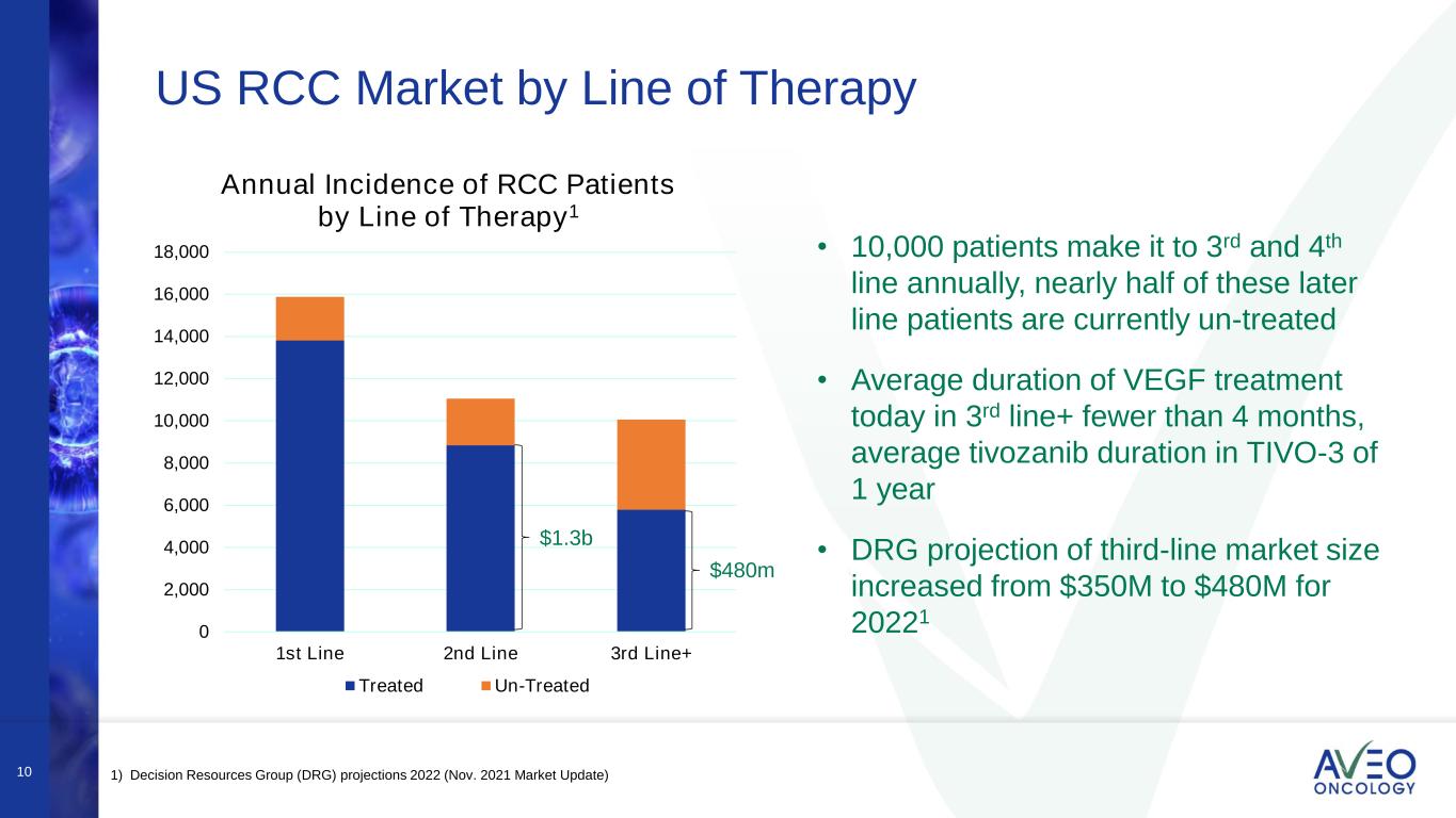 US RCC Market by Line of Therapy 0 2,000 4,000 6,000 8,000 10,000 12,000 14,000 16,000 18,000 1st Line 2nd Line 3rd Line+ Annual Incidence of RCC Patients by Line of Therapy1 Treated Un-Treated 1) Decision Resources Group (DRG) projections 2022 (Nov. 2021 Market Update) • 10,000 patients make it to 3rd and 4th line annually, nearly half of these later line patients are currently un-treated • Average duration of VEGF treatment today in 3rd line+ fewer than 4 months, average tivozanib duration in TIVO-3 of 1 year • DRG projection of third-line market size increased from $350M to $480M for 20221 $480m 10 $1.3b