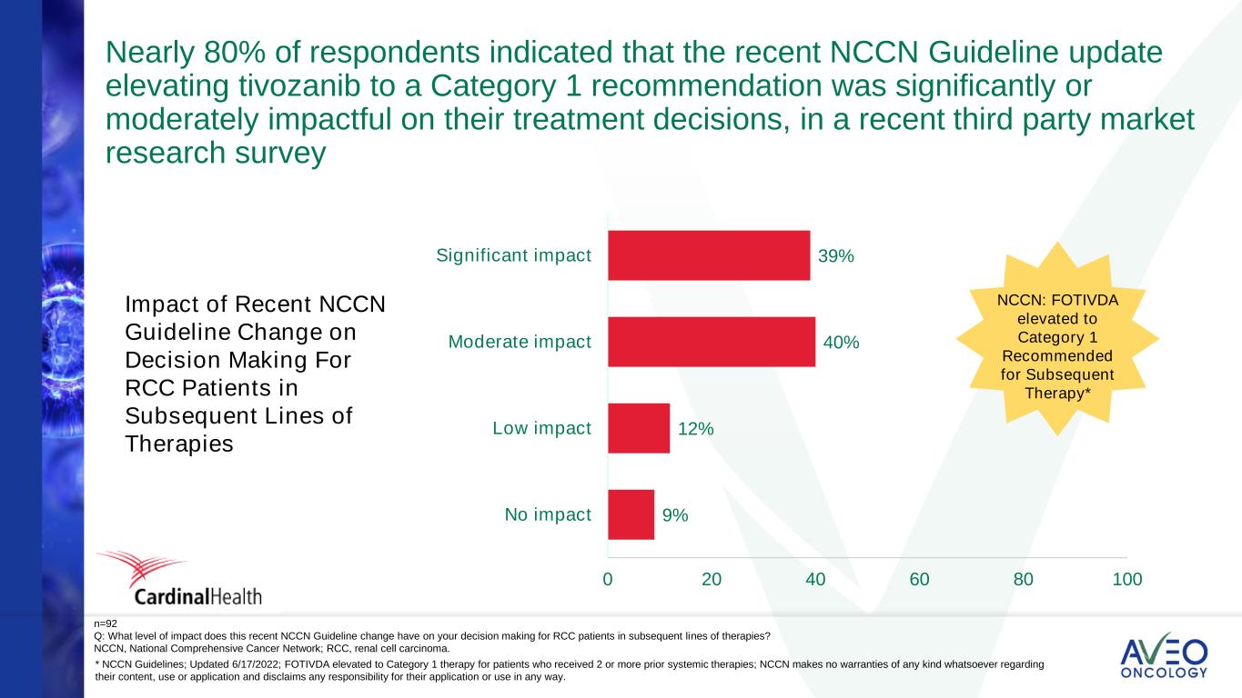 Nearly 80% of respondents indicated that the recent NCCN Guideline update elevating tivozanib to a Category 1 recommendation was significantly or moderately impactful on their treatment decisions, in a recent third party market research survey 9% 12% 40% 39% 0 20 40 60 80 100 No impact Low impact Moderate impact Significant impact Impact of Recent NCCN Guideline Change on Decision Making For RCC Patients in Subsequent Lines of Therapies n=92 Q: What level of impact does this recent NCCN Guideline change have on your decision making for RCC patients in subsequent lines of therapies? NCCN, National Comprehensive Cancer Network; RCC, renal cell carcinoma. * NCCN Guidelines; Updated 6/17/2022; FOTIVDA elevated to Category 1 therapy for patients who received 2 or more prior systemic therapies; NCCN makes no warranties of any kind whatsoever regarding their content, use or application and disclaims any responsibility for their application or use in any way. NCCN: FOTIVDA elevated to Category 1 Recommended for Subsequent Therapy*