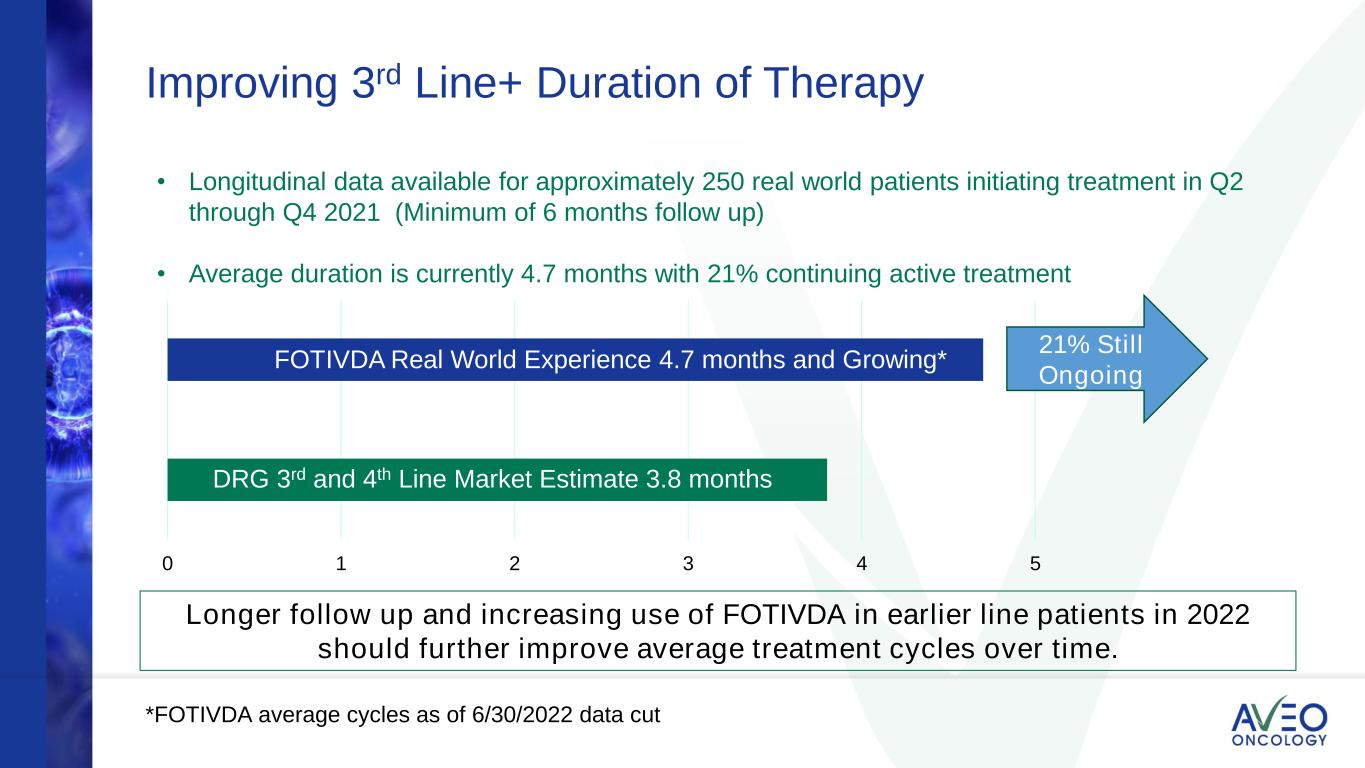 Improving 3rd Line+ Duration of Therapy • Longitudinal data available for approximately 250 real world patients initiating treatment in Q2 through Q4 2021 (Minimum of 6 months follow up) • Average duration is currently 4.7 months with 21% continuing active treatment 0 1 2 3 4 5 21% Still Ongoing Longer follow up and increasing use of FOTIVDA in earlier line patients in 2022 should further improve average treatment cycles over time. DRG 3rd and 4th Line Market Estimate 3.8 months FOTIVDA Real World Experience 4.7 months and Growing* *FOTIVDA average cycles as of 6/30/2022 data cut