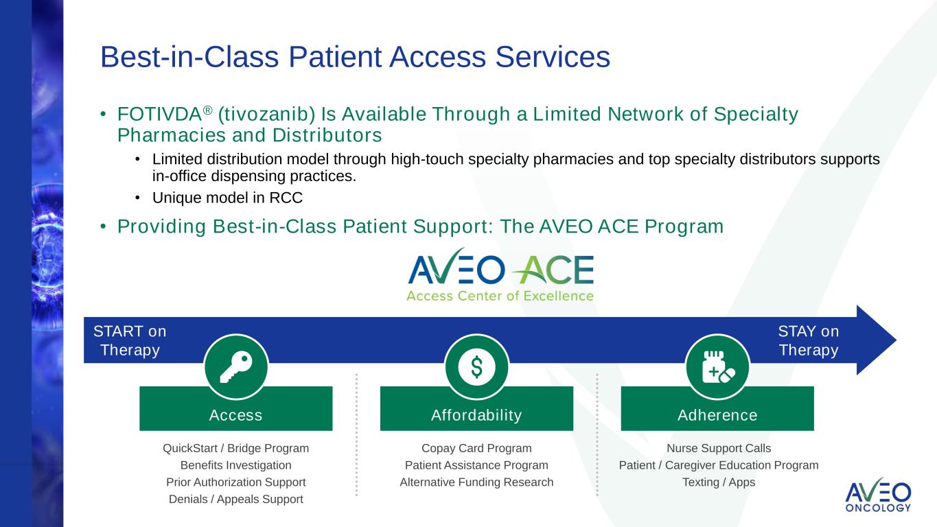 Best-in-Class Patient Access Services • FOTIVDA® (tivozanib) Is Available Through a Limited Network of Specialty Pharmacies and Distributors • Limited distribution model through high-touch specialty pharmacies and top specialty distributors supports in-office dispensing practices. • Unique model in RCC • Providing Best-in-Class Patient Support: The AVEO ACE Program Affordability AdherenceAccess START on Therapy STAY on Therapy QuickStart / Bridge Program Benefits Investigation Prior Authorization Support Denials / Appeals Support Copay Card Program Patient Assistance Program Alternative Funding Research Nurse Support Calls Patient / Caregiver Education Program Texting / Apps
