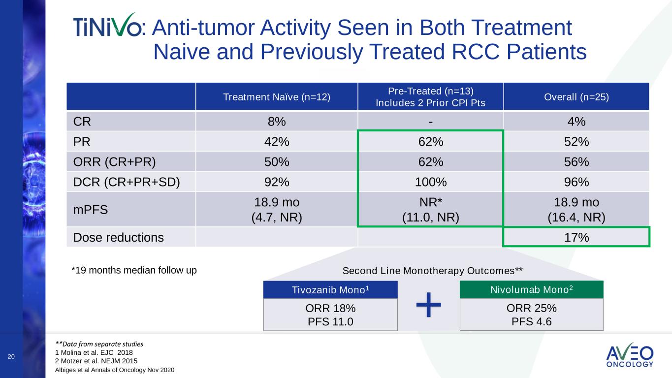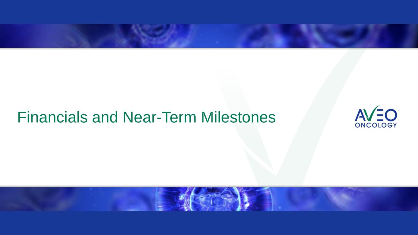 Clinical Trial Collaboration: Tivozanib and NKT2152 • AVEO and NiKang entered into a clinical trial collaboration and supply agreement to evaluate NKT2152, NiKang’s small molecule that inhibits hypoxia inducible factor 2α (HIF2α), in combination with tivozanib • Sixty patient Phase 2 clinical trial to evaluate the safety and efficacy of the combination of NKT2152 and tivozanib in clear cell RCC (ccRCC) patients who have not responded to or relapsed from prior therapies (R/R RCC) • NiKang to sponsor the trial; AVEO to co-fund the trial • AVEO and NiKang each to provide their respective drugs at no cost • Clinical trial expected to begin in 2022
