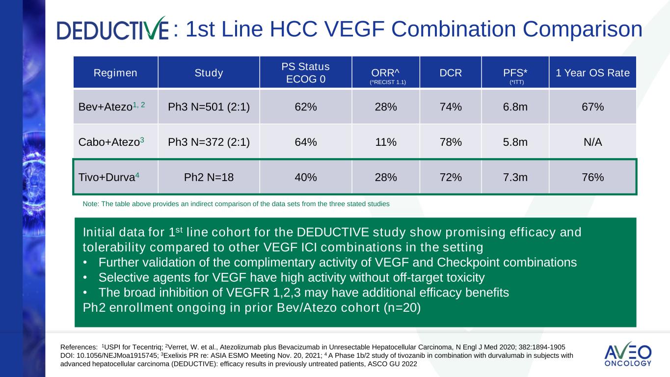 Regimen Study PS Status ECOG 0 ORR^ DCR PFS* 1 Year OS Rate Bev+Atezo1, 2 Ph3 N=501 (2:1) 62% 28% 74% 6.8m 67% Cabo+Atezo3 Ph3 N=372 (2:1) 64% 11% 78% 5.8m N/A Tivo+Durva4 Ph2 N=18 40% 28% 72% 7.3m 76% References: 1USPI for Tecentriq; 2Verret, W. et al., Atezolizumab plus Bevacizumab in Unresectable Hepatocellular Carcinoma, N Engl J Med 2020; 382:1894-1905 DOI: 10.1056/NEJMoa1915745; 3Exelixis PR re: ASIA ESMO Meeting Nov. 20, 2021; 4 A Phase 1b/2 study of tivozanib in combination with durvalumab in subjects with advanced hepatocellular carcinoma (DEDUCTIVE): efficacy results in previously untreated patients, ASCO GU 2022 : 1st Line HCC VEGF Combination Comparison Initial data for 1st line cohort for the DEDUCTIVE study show promising efficacy and tolerability compared to other VEGF ICI combinations in the setting • Further validation of the complimentary activity of VEGF and Checkpoint combinations • Selective agents for VEGF have high activity without off-target toxicity • The broad inhibition of VEGFR 1,2,3 may have additional efficacy benefits Ph2 enrollment ongoing in prior Bev/Atezo cohort (n=20) (*ITT) (^RECIST 1.1) Note: The table above provides an indirect comparison of the data sets from the three stated studies