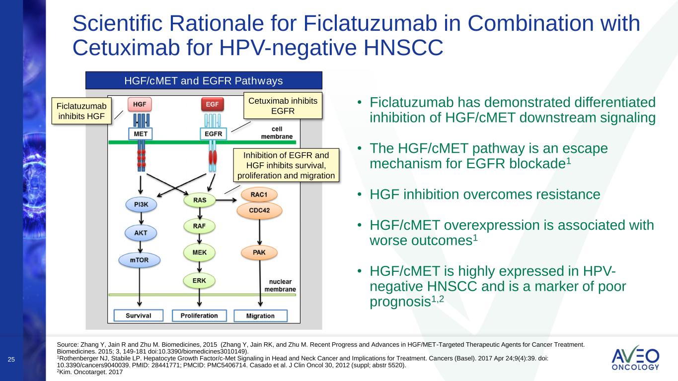 Scientific Rationale for Ficlatuzumab in Combination with Cetuximab for HPV-negative HNSCC 25 Source: Zhang Y, Jain R and Zhu M. Biomedicines, 2015 (Zhang Y, Jain RK, and Zhu M. Recent Progress and Advances in HGF/MET-Targeted Therapeutic Agents for Cancer Treatment. Biomedicines. 2015; 3, 149-181 doi:10.3390/biomedicines3010149). 1Rothenberger NJ, Stabile LP. Hepatocyte Growth Factor/c-Met Signaling in Head and Neck Cancer and Implications for Treatment. Cancers (Basel). 2017 Apr 24;9(4):39. doi: 10.3390/cancers9040039. PMID: 28441771; PMCID: PMC5406714. Casado et al. J Clin Oncol 30, 2012 (suppl; abstr 5520). 2Kim. Oncotarget. 2017 HGF/cMET and EGFR Pathways Ficlatuzumab inhibits HGF Cetuximab inhibits EGFR Inhibition of EGFR and HGF inhibits survival, proliferation and migration • Ficlatuzumab has demonstrated differentiated inhibition of HGF/cMET downstream signaling • The HGF/cMET pathway is an escape mechanism for EGFR blockade1 • HGF inhibition overcomes resistance • HGF/cMET overexpression is associated with worse outcomes1 • HGF/cMET is highly expressed in HPV- negative HNSCC and is a marker of poor prognosis1,2
