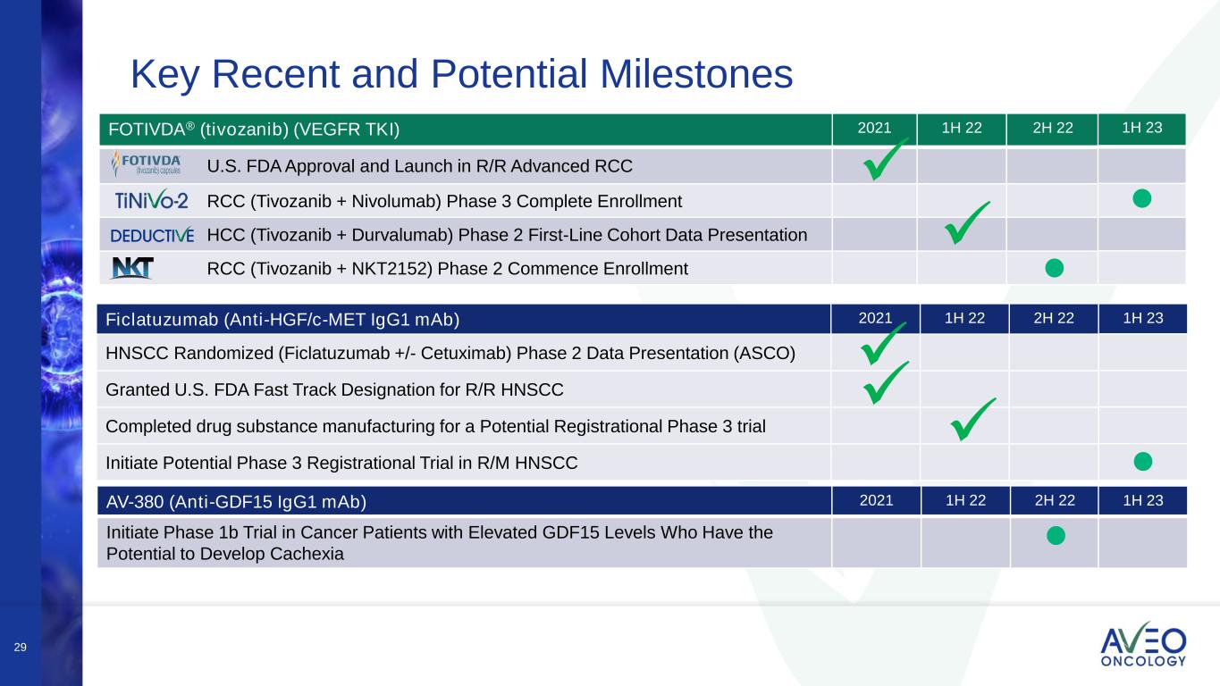 28 Cash as of June 30, 2022 $77.2M Total U.S. Net Product Revenue 2Q 2022 $25.0M Debt as of June 30, 2022 $38.4M Shares Outstanding as of June 30, 2022 34.6M 2Q 2022 1H 2022 Cash Burn from Operations ($1.9M) ($10.2M) AVEO believes that its current cash, cash equivalents and marketable securities, along with expected net product revenues from the commercial launch of FOTIVDA in the U.S., would enable AVEO to maintain its current operations for a period of more than 12 months following the filing of its Quarterly Report on Form 10-Q for the quarter ended June 30, 2022 Financial Snapshot as of June 30, 2022