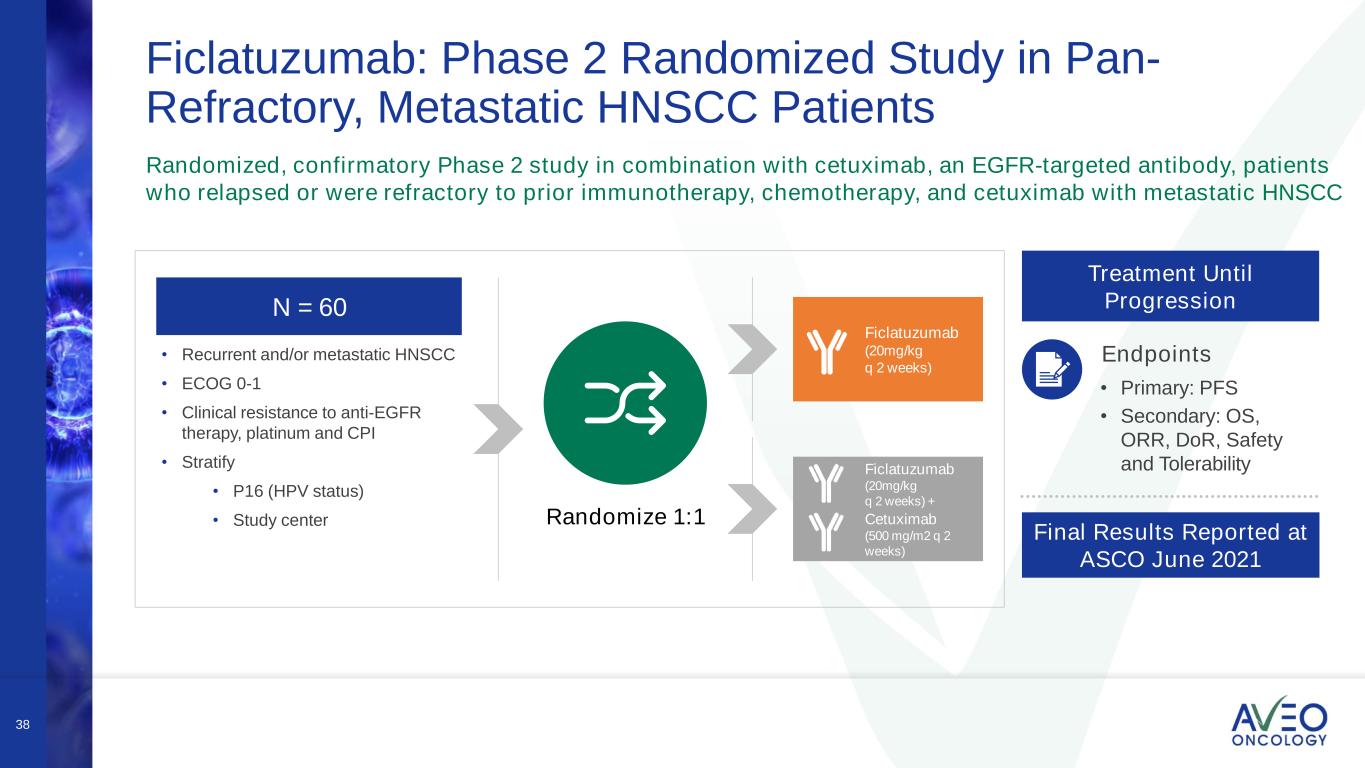 Ficlatuzumab: Phase 2 Randomized Study in Pan- Refractory, Metastatic HNSCC Patients Randomized, confirmatory Phase 2 study in combination with cetuximab, an EGFR-targeted antibody, patients who relapsed or were refractory to prior immunotherapy, chemotherapy, and cetuximab with metastatic HNSCC N = 60 • Recurrent and/or metastatic HNSCC • ECOG 0-1 • Clinical resistance to anti-EGFR therapy, platinum and CPI • Stratify • P16 (HPV status) • Study center Randomize 1:1 Ficlatuzumab (20mg/kg q 2 weeks) Ficlatuzumab (20mg/kg q 2 weeks) + Cetuximab (500 mg/m2 q 2 weeks) Treatment Until Progression Endpoints • Primary: PFS • Secondary: OS, ORR, DoR, Safety and Tolerability 38 Final Results Reported at ASCO June 2021