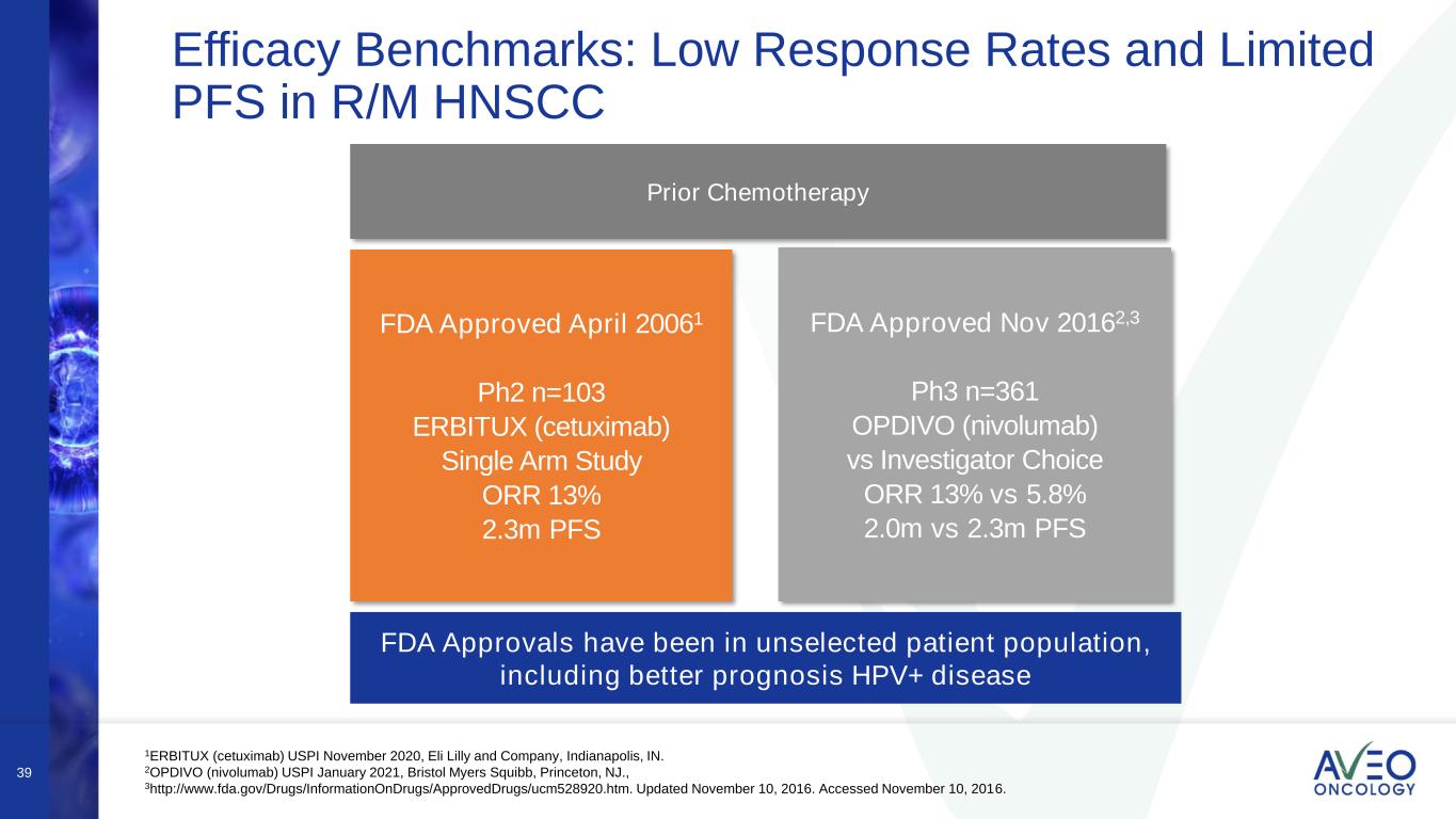 FDA Approved Nov 20162,3 Ph3 n=361 OPDIVO (nivolumab) vs Investigator Choice ORR 13% vs 5.8% 2.0m vs 2.3m PFS 1ERBITUX (cetuximab) USPI November 2020, Eli Lilly and Company, Indianapolis, IN. 2OPDIVO (nivolumab) USPI January 2021, Bristol Myers Squibb, Princeton, NJ., 3http://www.fda.gov/Drugs/InformationOnDrugs/ApprovedDrugs/ucm528920.htm. Updated November 10, 2016. Accessed November 10, 2016. Efficacy Benchmarks: Low Response Rates and Limited PFS in R/M HNSCC FDA Approvals have been in unselected patient population, including better prognosis HPV+ disease FDA Approved April 20061 Ph2 n=103 ERBITUX (cetuximab) Single Arm Study ORR 13% 2.3m PFS Prior Chemotherapy 39