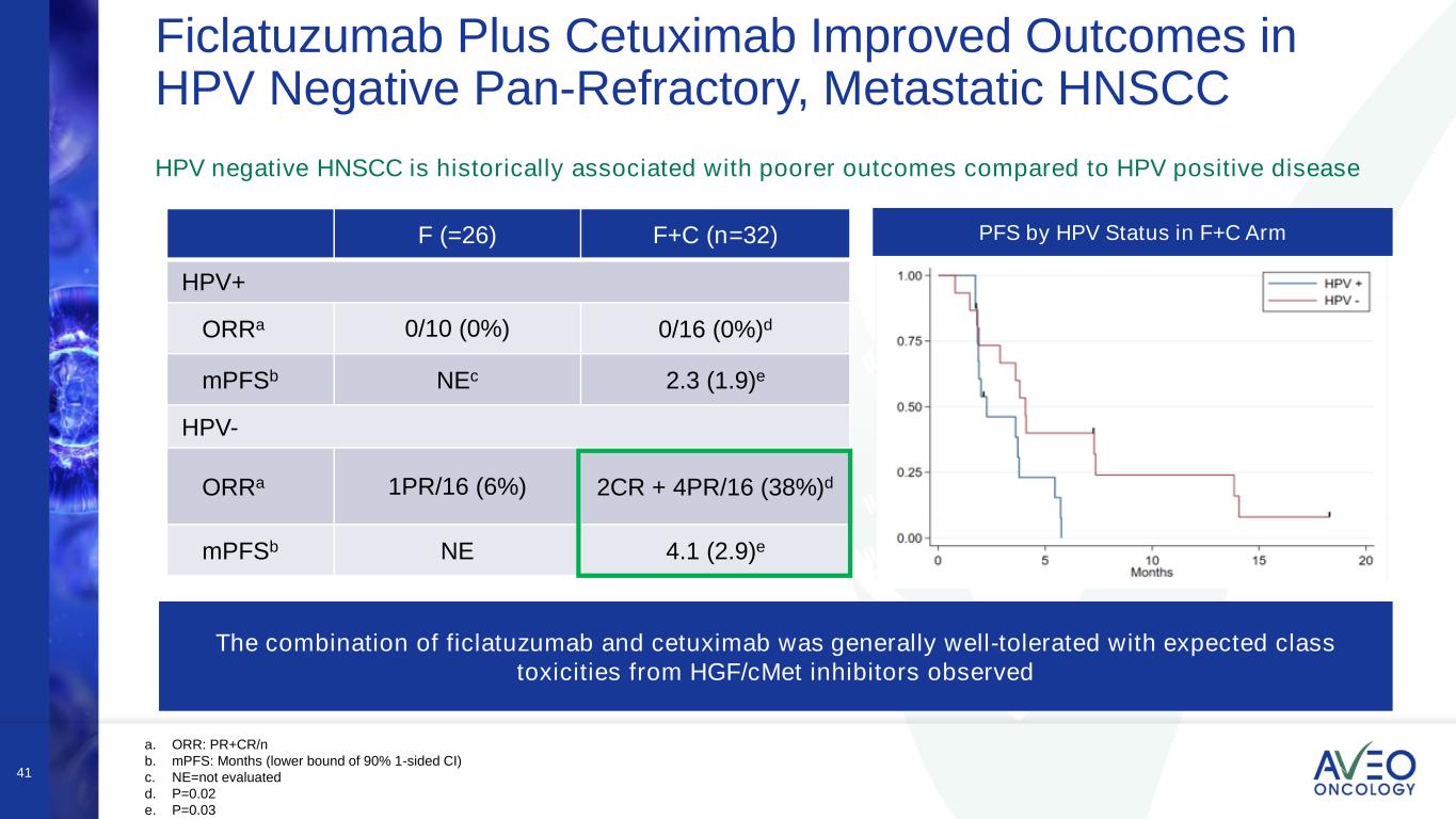 41 Ficlatuzumab Plus Cetuximab Improved Outcomes in HPV Negative Pan-Refractory, Metastatic HNSCC HPV negative HNSCC is historically associated with poorer outcomes compared to HPV positive disease F (=26) F+C (n=32) HPV+ ORRa 0/10 (0%) 0/16 (0%)d mPFSb NEc 2.3 (1.9)e HPV- ORRa 1PR/16 (6%) 2CR + 4PR/16 (38%)d mPFSb NE 4.1 (2.9)e a. ORR: PR+CR/n b. mPFS: Months (lower bound of 90% 1-sided CI) c. NE=not evaluated d. P=0.02 e. P=0.03 The combination of ficlatuzumab and cetuximab was generally well-tolerated with expected class toxicities from HGF/cMet inhibitors observed PFS by HPV Status in F+C Arm