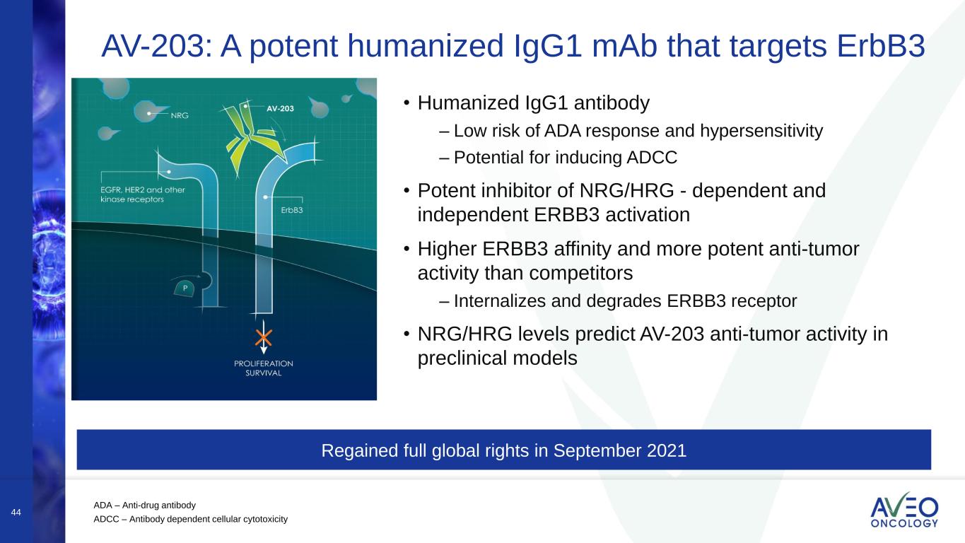 AV-203: A potent humanized IgG1 mAb that targets ErbB3 • Humanized IgG1 antibody – Low risk of ADA response and hypersensitivity – Potential for inducing ADCC • Potent inhibitor of NRG/HRG - dependent and independent ERBB3 activation • Higher ERBB3 affinity and more potent anti-tumor activity than competitors – Internalizes and degrades ERBB3 receptor • NRG/HRG levels predict AV-203 anti-tumor activity in preclinical models Regained full global rights in September 2021 44 ADA – Anti-drug antibody ADCC – Antibody dependent cellular cytotoxicity .