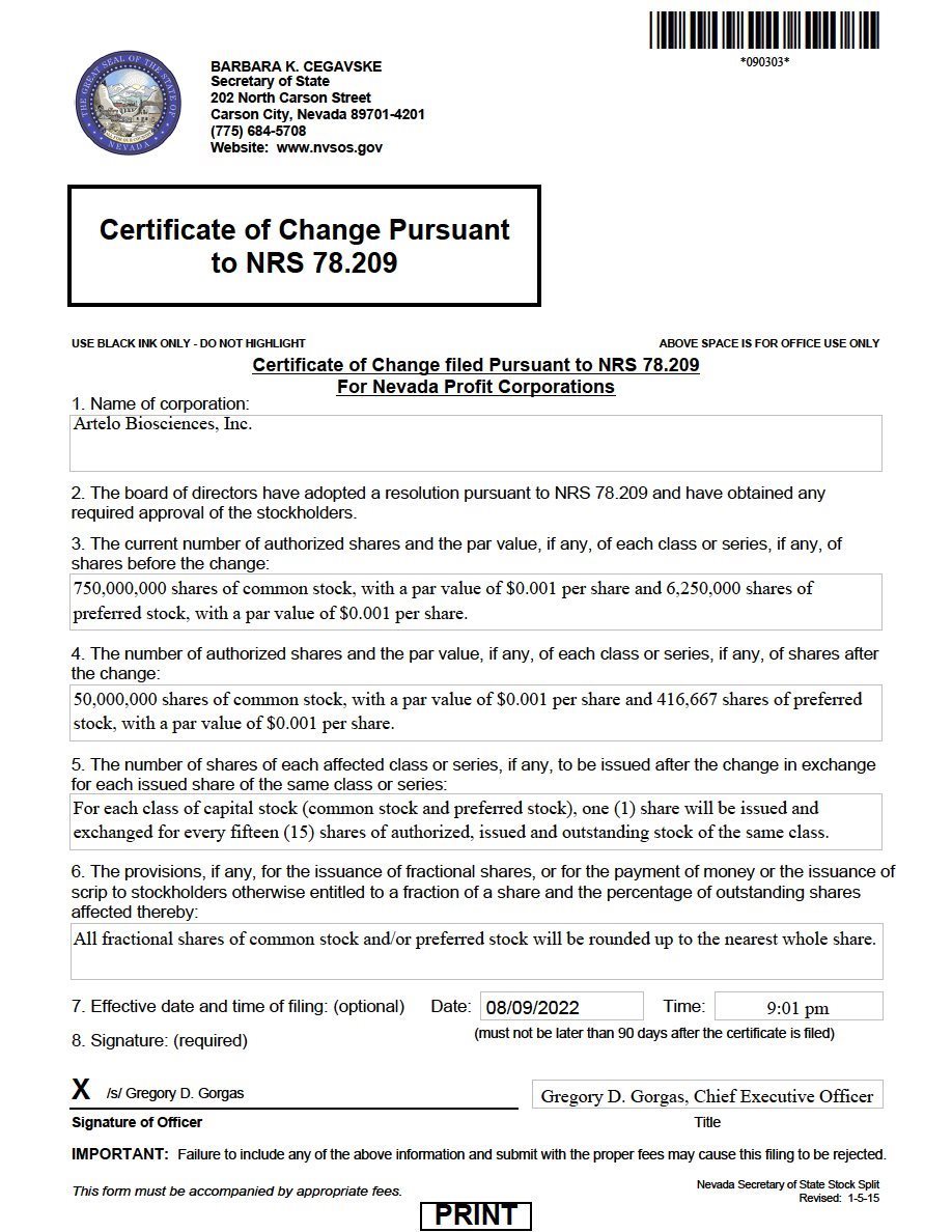 On August 8, 2022, Artelo Biosciences, Inc., a Nevada corporation (the “Company”), filed with the Secretary of State of the State of Nevada a Certificate of Change (the “Certificate of Change”), pursuant to Nevada Revised Statutes 78.209, to effect a one-for-fifteen (1-for-15) reverse stock split (the “Reverse Split”) of the Company’s issued and outstanding common stock, par value $0.001 per share (the “Common Stock”). The Reverse Split will be effective as of 12:01 a.m. Eastern Time on August 10, 2022 (the “Effective Time”). Pursuant to the Nevada Revised Statutes 78.207, the Company’s board of directors has the authority to effect a reverse stock split without stockholder approval if the number of authorized shares of Common Stock and the number of outstanding shares of Common Stock are proportionally reduced.