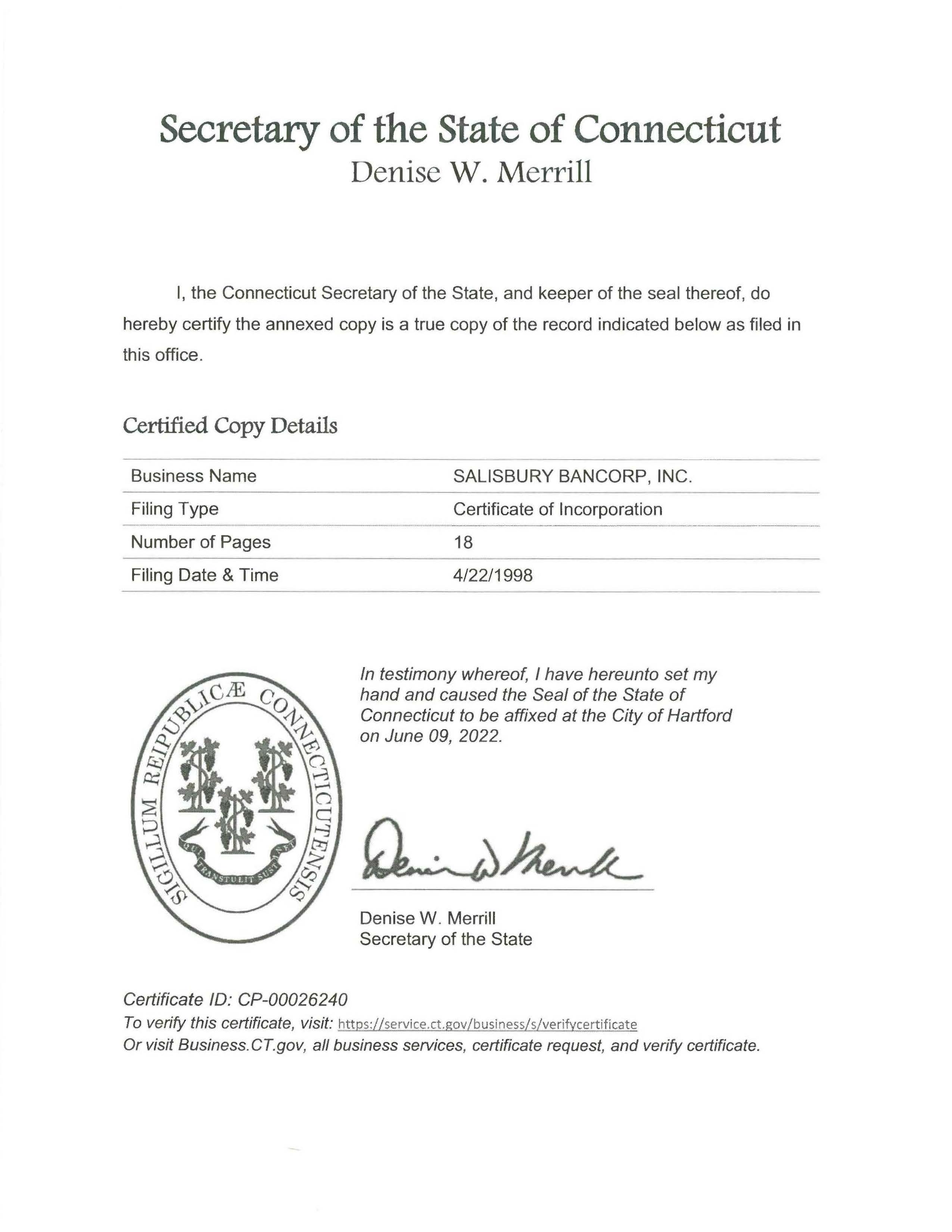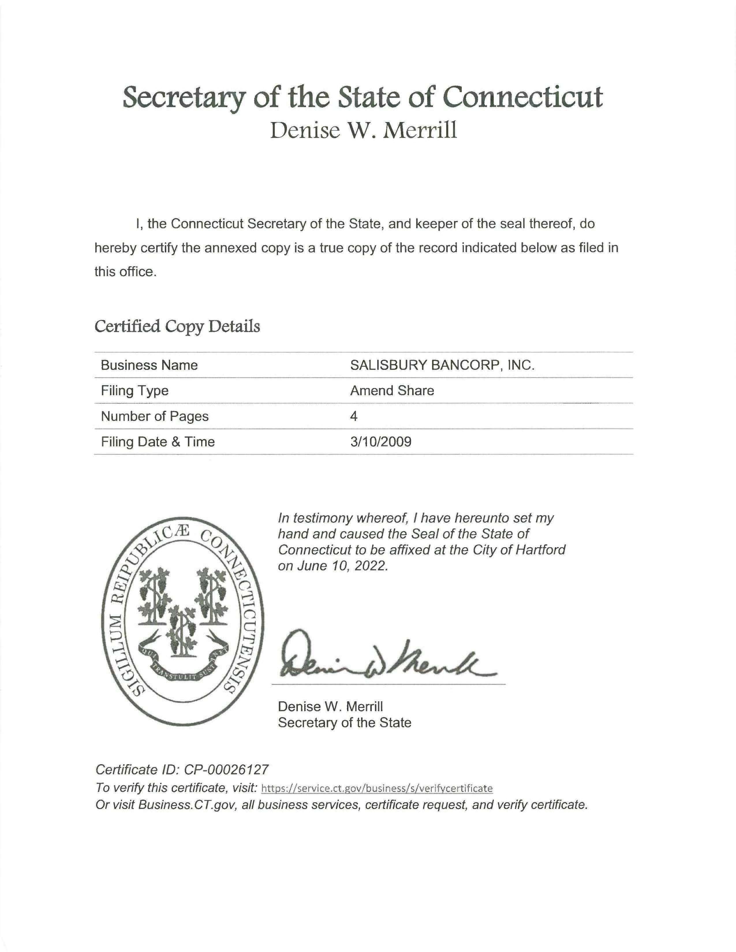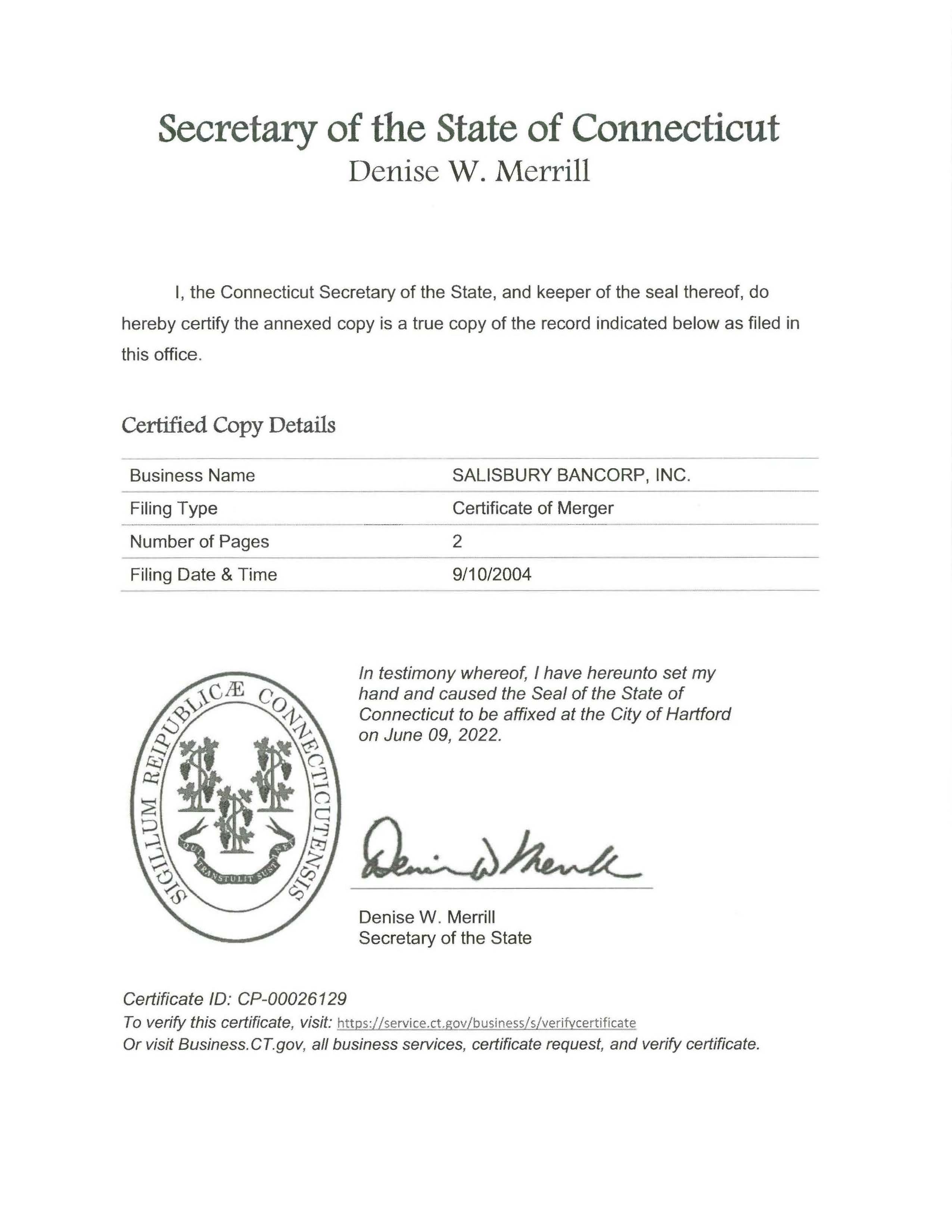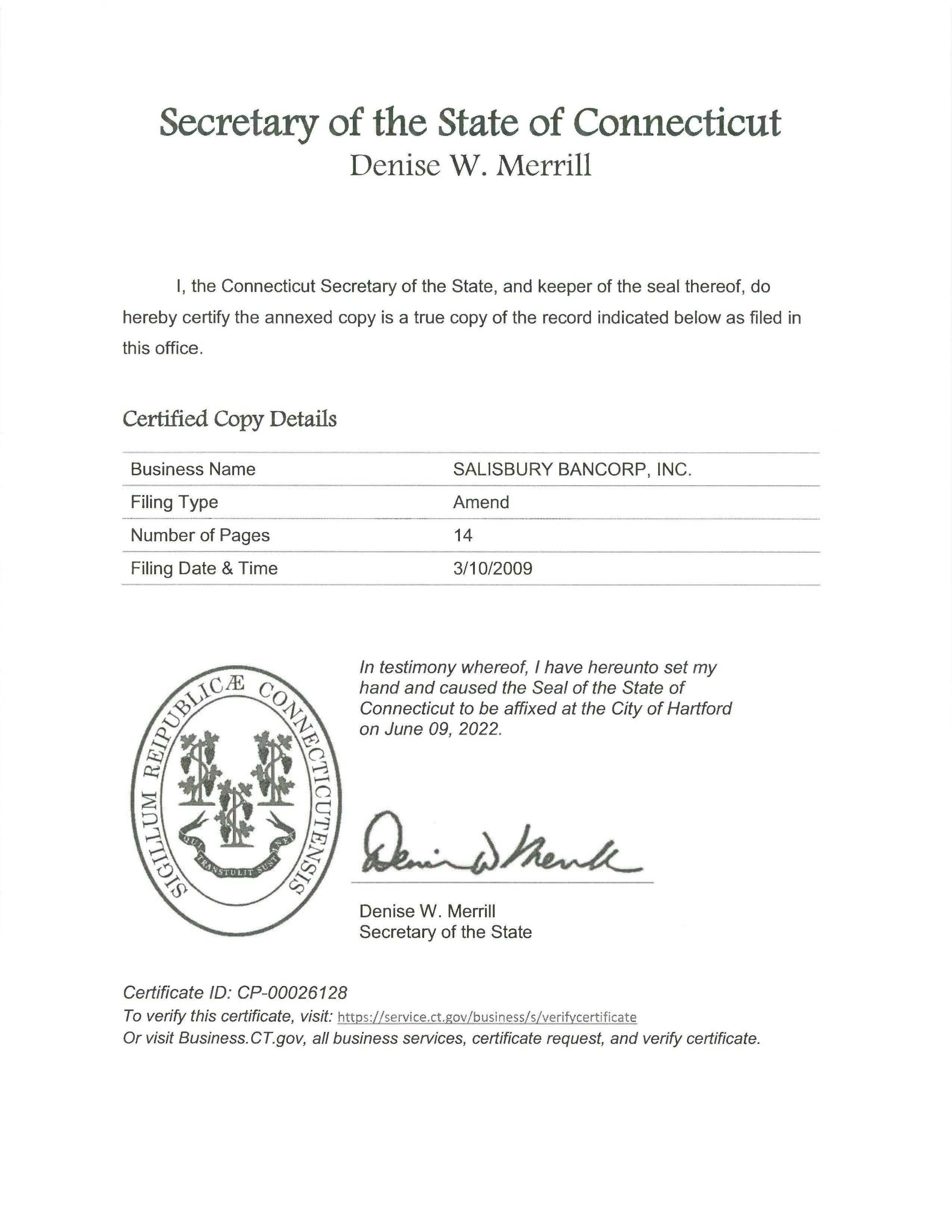 | (f) | the effect of the COVID-19 pandemic on Salisbury, the communities served by the Bank, the State of Connecticut and the United States, related to the economy and overall financial stability; |