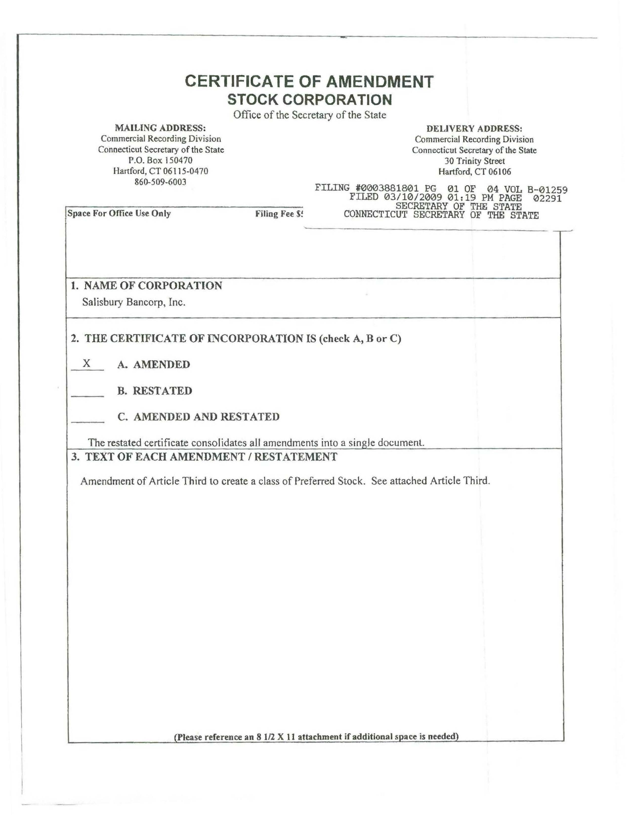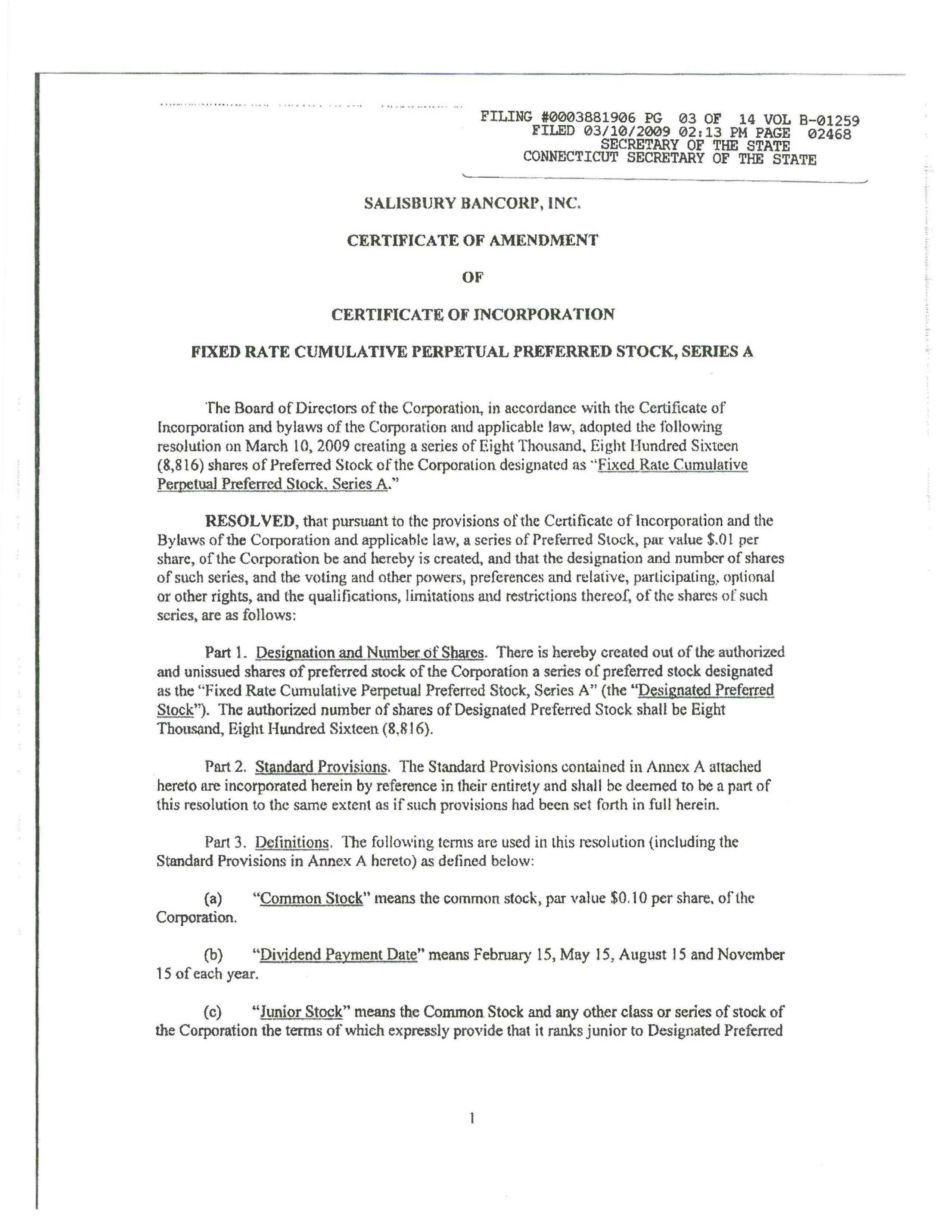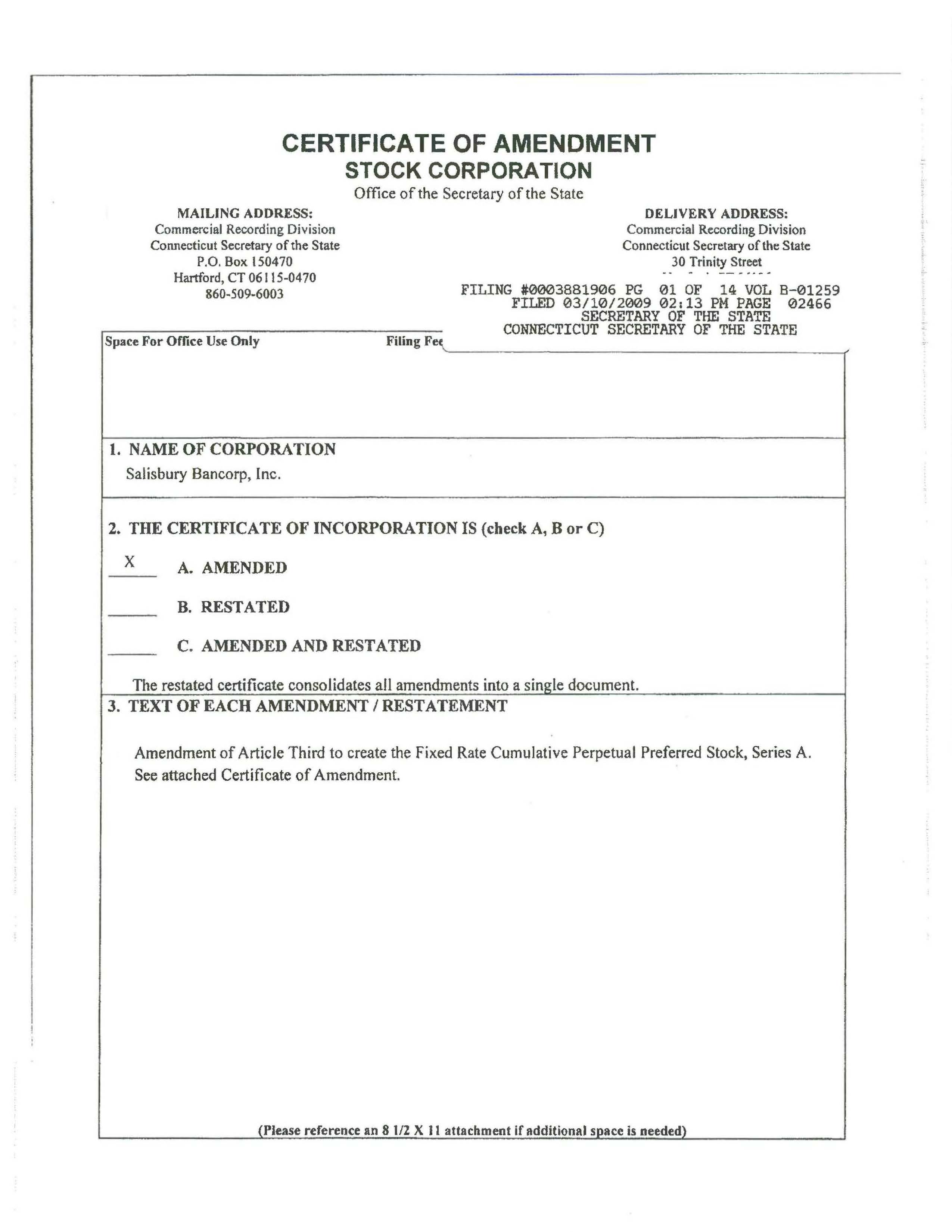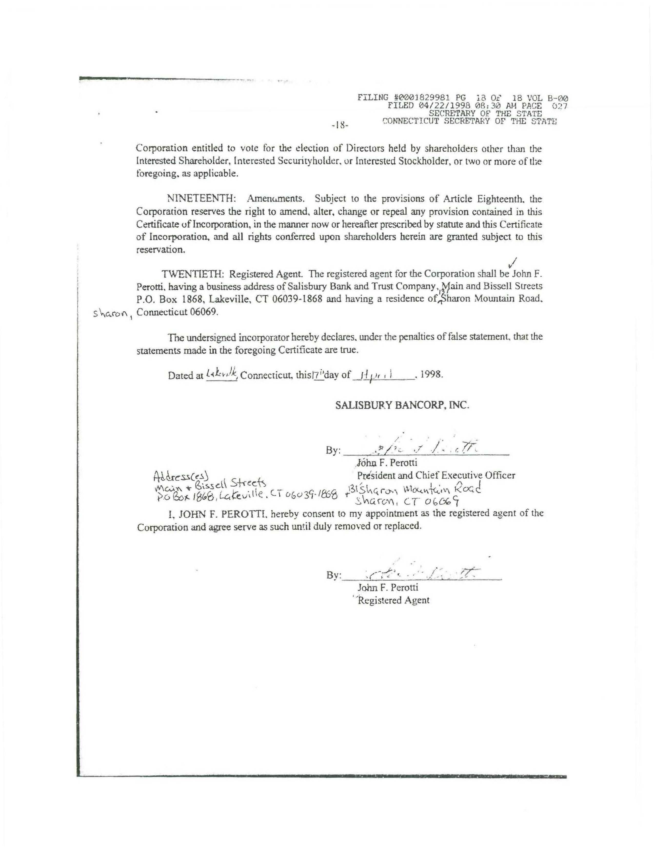 | (f) | the effect of the COVID-19 pandemic on Salisbury, the communities served by the Bank, the State of Connecticut and the United States, related to the economy and overall financial stability; |