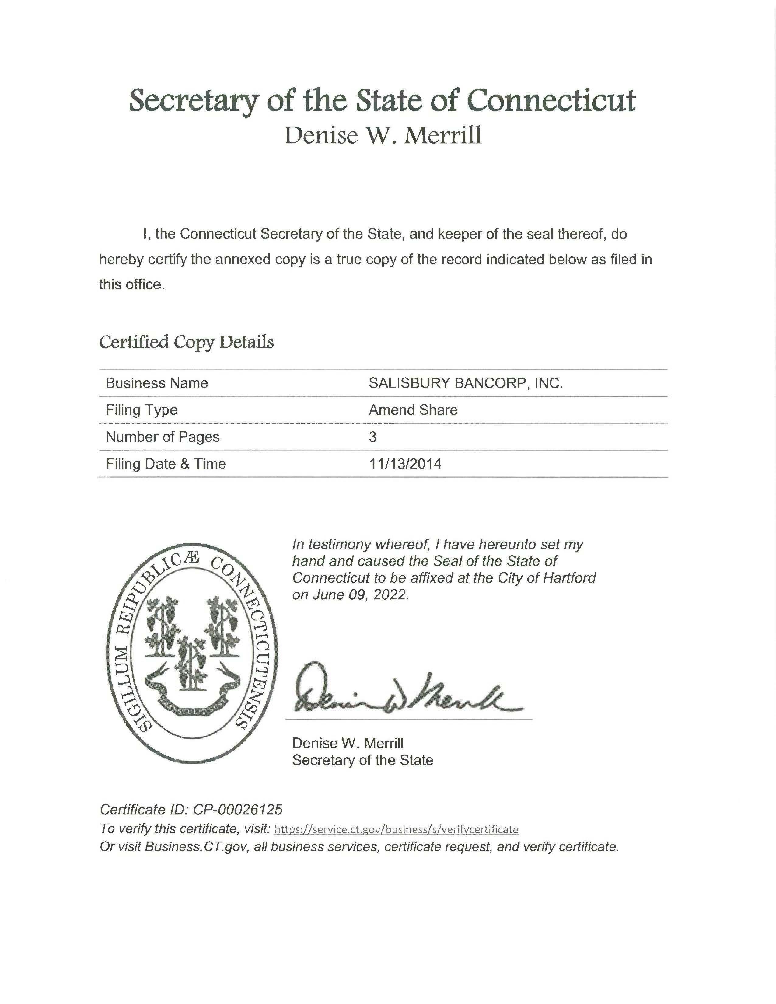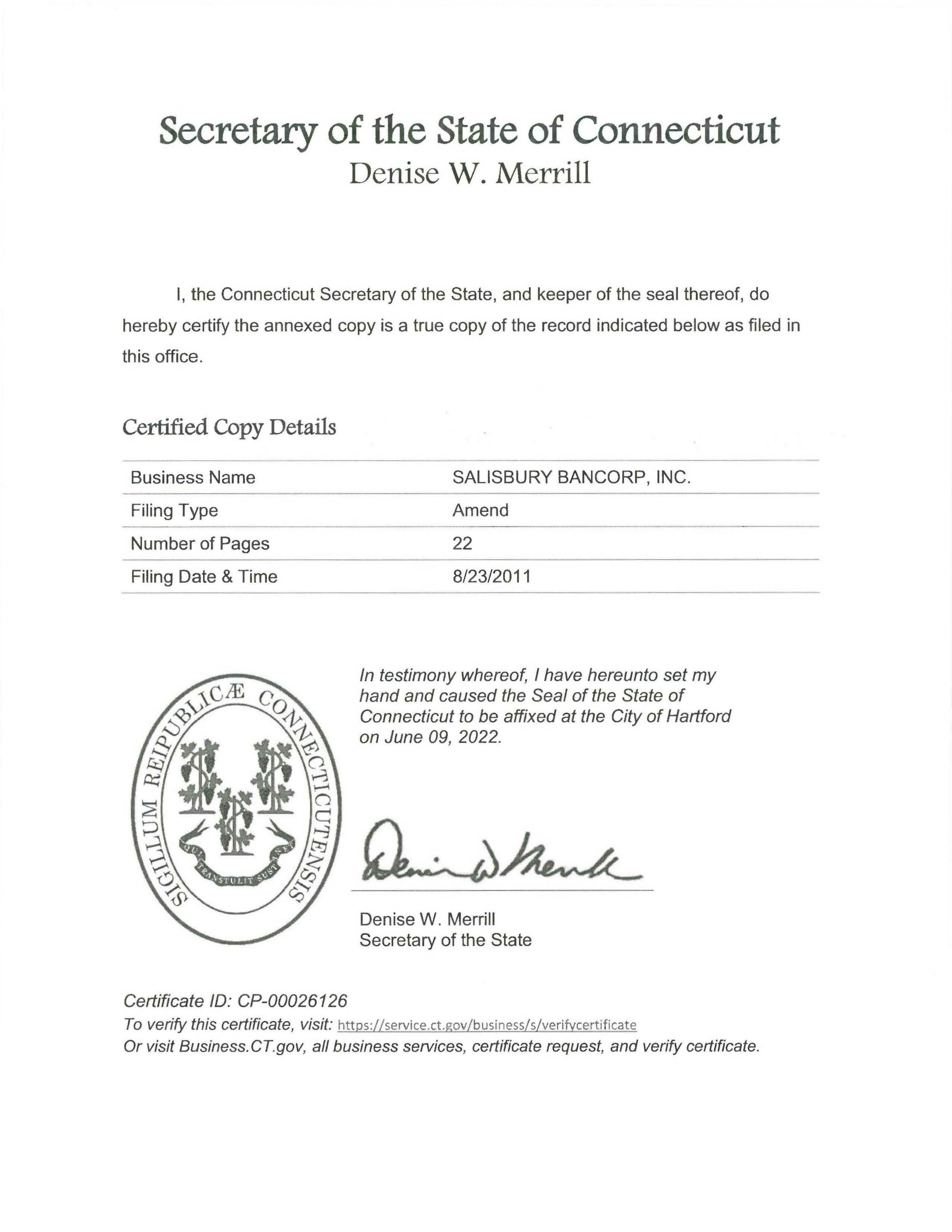 In addition, based on an evaluation of its internal controls over financial reporting, no change in Salisbury’s internal control over financial reporting occurred during the quarter ended June 30, 2022 that has materially affected, or is reasonably likely to materially affect, Salisbury’s internal control over financial reporting.