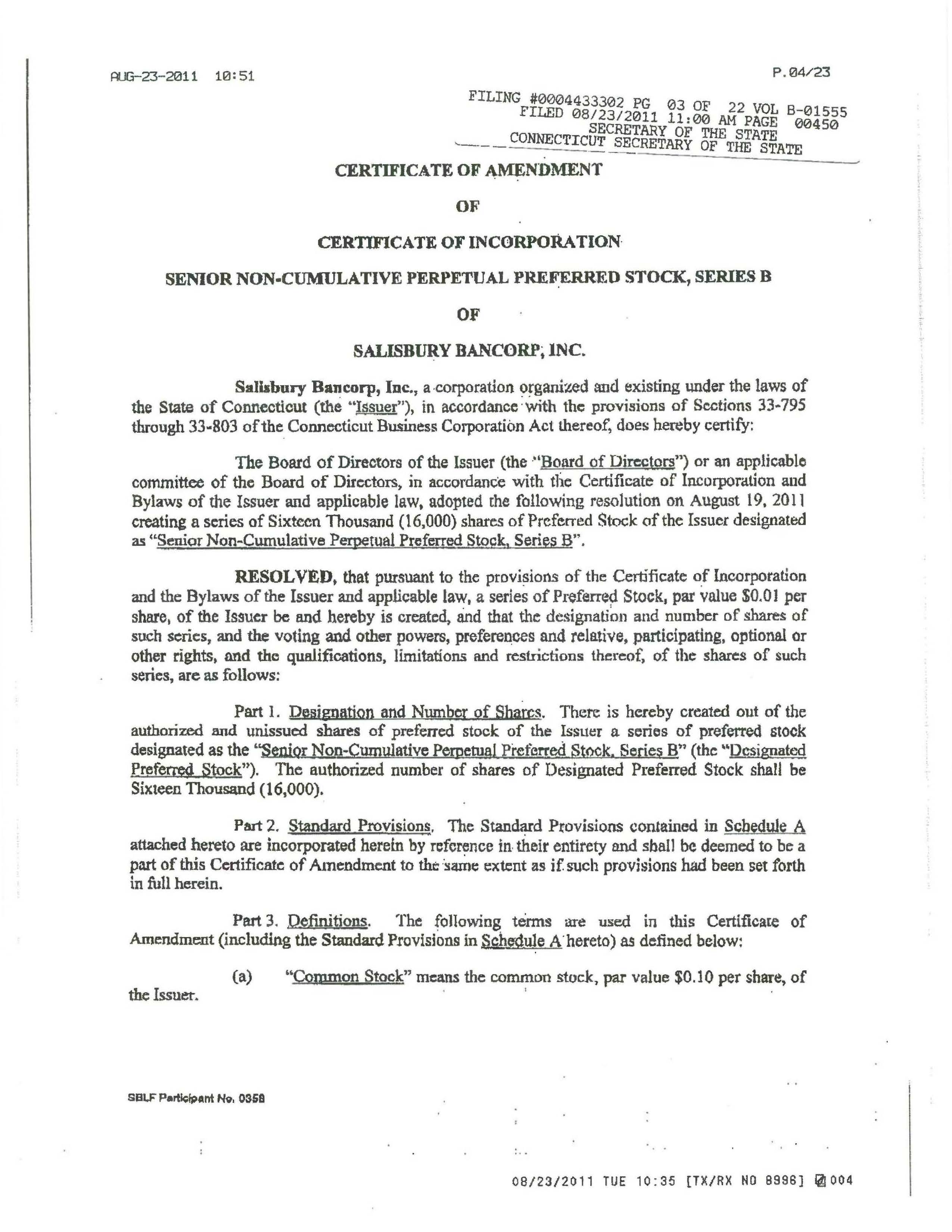 | 1. | I have reviewed this quarterly report on Form 10-Q of Salisbury Bancorp, Inc.; |