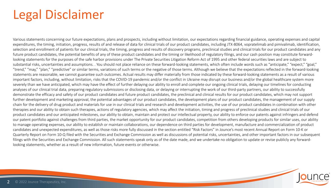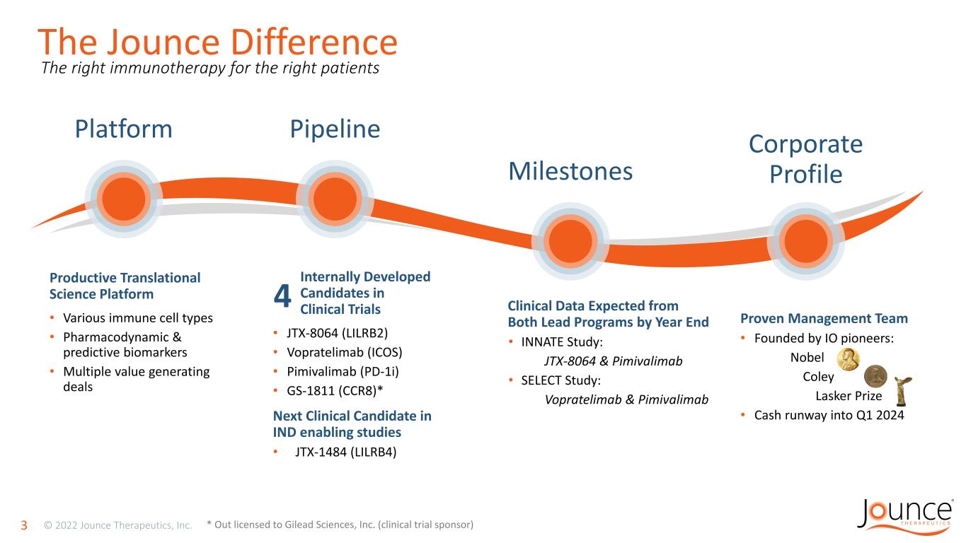 Legal Disclaimer 2 Various statements concerning our future expectations, plans and prospects, including without limitation, our expectations regarding financial guidance, operating expenses and capital expenditures, the timing, initiation, progress, results of and release of data for clinical trials of our product candidates, including JTX-8064, vopratelimab and pimivalimab, identification, selection and enrollment of patients for our clinical trials, the timing, progress and results of discovery programs, preclinical studies and clinical trials for our product candidates and any future product candidates, the potential benefits of any of these product candidates and the timing or likelihood of regulatory filings, and our cash position may constitute forward- looking statements for the purposes of the safe harbor provisions under The Private Securities Litigation Reform Act of 1995 and other federal securities laws and are subject to substantial risks, uncertainties and assumptions. . You should not place reliance on these forward-looking statements, which often include words such as “anticipate,” “expect,” “goal,” ”trend,” “may,” “plan,” “predictive” or similar terms, variations of such terms or the negative of those terms. Although we believe that the expectations reflected in the forward-looking statements are reasonable, we cannot guarantee such outcomes. Actual results may differ materially from those indicated by these forward-looking statements as a result of various important factors, including, without limitation, risks that the COVID-19 pandemic and/or the conflict in Ukraine may disrupt our business and/or the global healthcare system more severely than we have anticipated, which may have the effect of further delaying our ability to enroll and complete our ongoing clinical trials, delaying our timelines for conducting analyses of our clinical trial data, preparing regulatory submissions or disclosing data, or delaying or interrupting the work of our third-party partners, our ability to successfully demonstrate the efficacy and safety of our product candidates and future product candidates, the preclinical and clinical results for our product candidates, which may not support further development and marketing approval, the potential advantages of our product candidates, the development plans of our product candidates, the management of our supply chain for the delivery of drug product and materials for use in our clinical trials and research and development activities, the use of our product candidates in combination with other therapies and our ability to obtain such therapies, actions of regulatory agencies, which may affect the initiation, timing and progress of preclinical studies and clinical trials of our product candidates and our anticipated milestones, our ability to obtain, maintain and protect our intellectual property, our ability to enforce our patents against infringers and defend our patent portfolio against challenges from third parties, the market opportunity for our product candidates, competition from others developing products for similar uses, our ability to manage operating expenses, our ability to establish or maintain collaborations, our dependence on third parties for development, manufacture and commercialization of product candidates and unexpected expenditures, as well as those risks more fully discussed in the section entitled “Risk Factors” in Jounce’s most recent Annual Report on Form 10-K or Quarterly Report on Form 10-Q filed with the Securities and Exchange Commission as well as discussions of potential risks, uncertainties, and other important factors in our subsequent filings with the Securities and Exchange Commission. All such statements speak only as of the date made, and we undertake no obligation to update or revise publicly any forward- looking statements, whether as a result of new information, future events or otherwise.