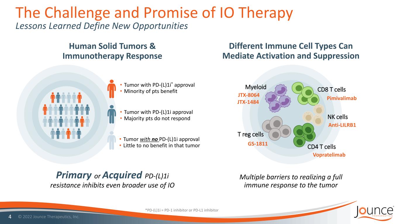 Proven Management Team • Founded by IO pioneers: Nobel Coley Lasker Prize • Cash runway into Q1 2024 The Jounce Difference 3 * Out licensed to Gilead Sciences, Inc. (clinical trial sponsor) The right immunotherapy for the right patients Productive Translational Science Platform • Various immune cell types • Pharmacodynamic & predictive biomarkers • Multiple value generating deals Internally Developed Candidates in Clinical Trials • JTX-8064 (LILRB2) • Vopratelimab (ICOS) • Pimivalimab (PD-1i) • GS-1811 (CCR8)* Next Clinical Candidate in IND enabling studies • JTX-1484 (LILRB4) 4 Platform Pipeline Milestones Corporate Profile Clinical Data Expected from Both Lead Programs by Year End • INNATE Study: JTX-8064 & Pimivalimab • SELECT Study: Vopratelimab & Pimivalimab