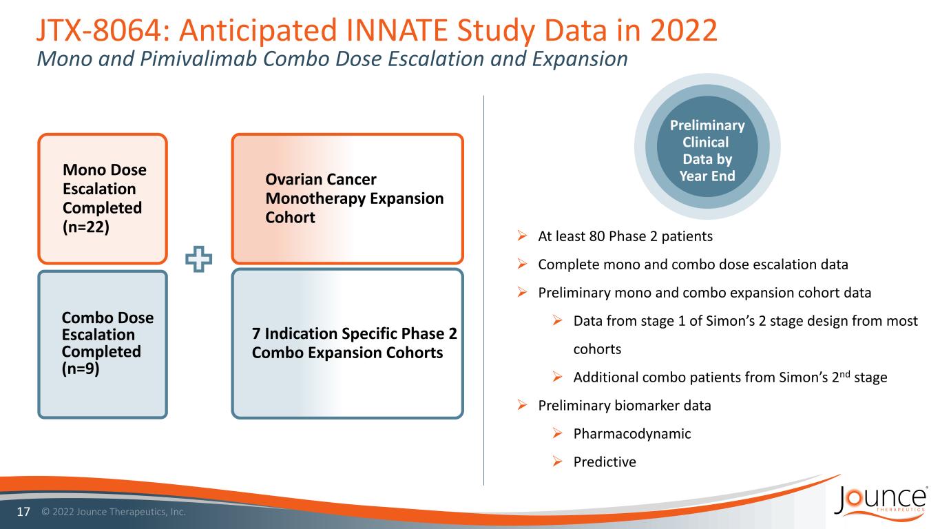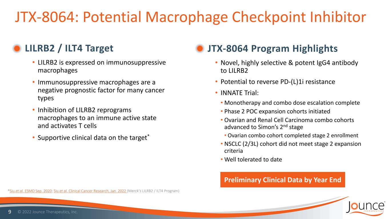 Mono (n=22) & Combo (n=9) Dose Escalation Completed JTX-8064: INNATE Study Designed to Rapidly Demonstrate POC Preliminary Clinical Data by Year End 2022 • Full receptor occupancy at 300mg • 700mg RP2D* • No DLTs** (up to 1200mg) 14 Combo expansions • Ovarian (3/4L) • HNSCC (1L) • Sarcoma (2-4L) • HNSCC (2/3L) • ccRCC (2/3L) • NSCLC (2/3L)†† • cSCC (2/3L) PD-(L)1 Resistant Patients Mono expansion • Ovarian (3/4L) IO Naïve Patients • Ovarian (3/4L IO naïve) • ccRCC (2/3L PD-(L)1 resistant) Simon’s 2-Stage Expansion Cohorts Stage 1 (n = 14 mono; 10 combo) Stage 2 (Total n = up to 47 mono; 29 combo) † * RP2D = recommended Phase 2 Dose; ** DLT = Dose Limiting Toxicities; † Combined total of Stage 1 and 2 †† Did not meet criteria for stage 2 expansion
