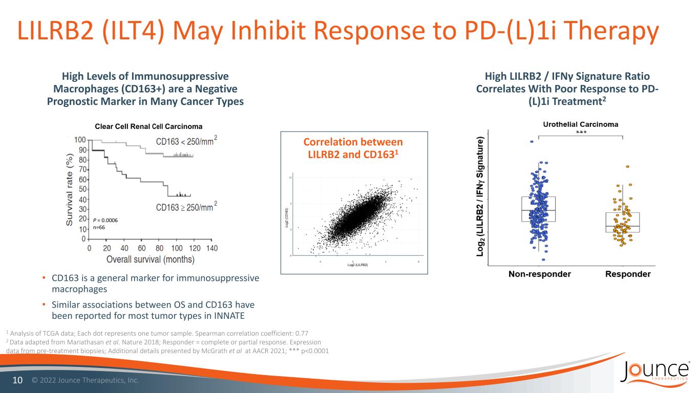 JTX-8064: Potential Macrophage Checkpoint Inhibitor LILRB2 / ILT4 Target • LILRB2 is expressed on immunosuppressive macrophages • Immunosuppressive macrophages are a negative prognostic factor for many cancer types • Inhibition of LILRB2 reprograms macrophages to an immune active state and activates T cells • Supportive clinical data on the target* 9 *Siu et al. ESMO Sep. 2020; Siu et al. Clinical Cancer Research, Jan. 2022 (Merck’s LILRB2 / ILT4 Program) JTX-8064 Program Highlights • Novel, highly selective & potent IgG4 antibody to LILRB2 • Potential to reverse PD-(L)1i resistance • INNATE Trial: • Monotherapy and combo dose escalation complete • Phase 2 POC expansion cohorts initiated • Ovarian and Renal Cell Carcinoma combo cohorts advanced to Simon’s 2nd stage • Ovarian combo cohort completed stage 2 enrollment • NSCLC (2/3L) cohort did not meet stage 2 expansion criteria • Well tolerated to date Preliminary Clinical Data by Year End