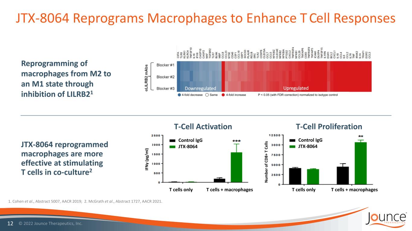 JTX-8064 Inhibits A Unique Macrophage Checkpoint LILRB2 (ILT4) Proposed mechanism of action 11 Potential to Reverse PD-(L)1i Resistance JTX-8064 Immunosuppressive Macrophage (M2-like) Immune Activated Macrophage (M1-like) • Cytokine Production • Antigen Presentation • T-cell Activation