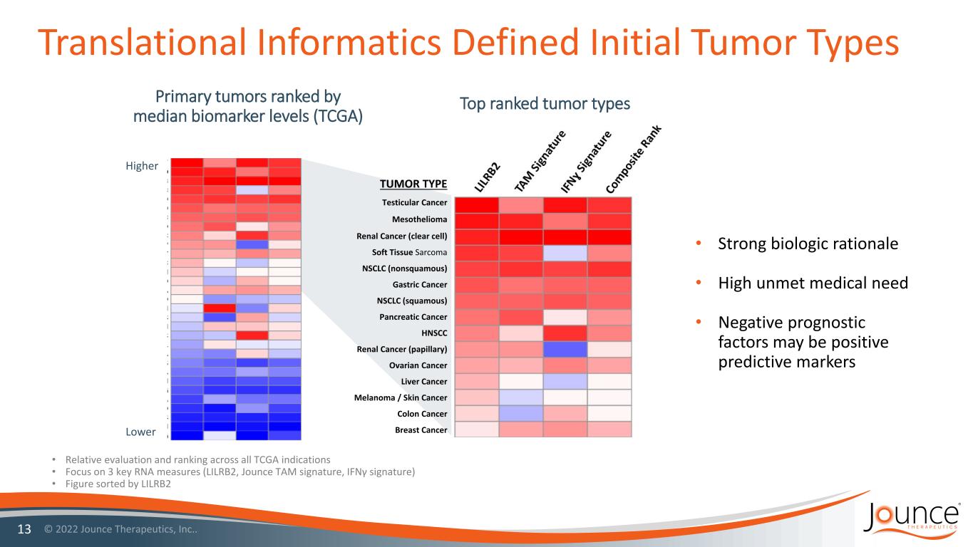 JTX-8064 Reprograms Macrophages to Enhance T Cell Responses 12 1. Cohen et al., Abstract 5007, AACR 2019; 2. McGrath et al., Abstract 1727, AACR 2021. JTX-8064 reprogrammed macrophages are more effective at stimulating T cells in co-culture2 Reprogramming of macrophages from M2 to an M1 state through inhibition of LILRB21 JTX-8064 precursors polarize macrophages to an M1 state1 Control IgG JTX-8064 T cells only T cells + macrophagesT cells only T cells + macrophages Control IgG JTX-8064 IF N γ (p g/ m l) N um be r o f C D8 + T Ce lls 4-fold decrease 4-fold increaseSame P < 0.05 (with FDR correction) normalized to isotype control T-Cell Activation T-Cell Proliferation Downregulated Upregulated