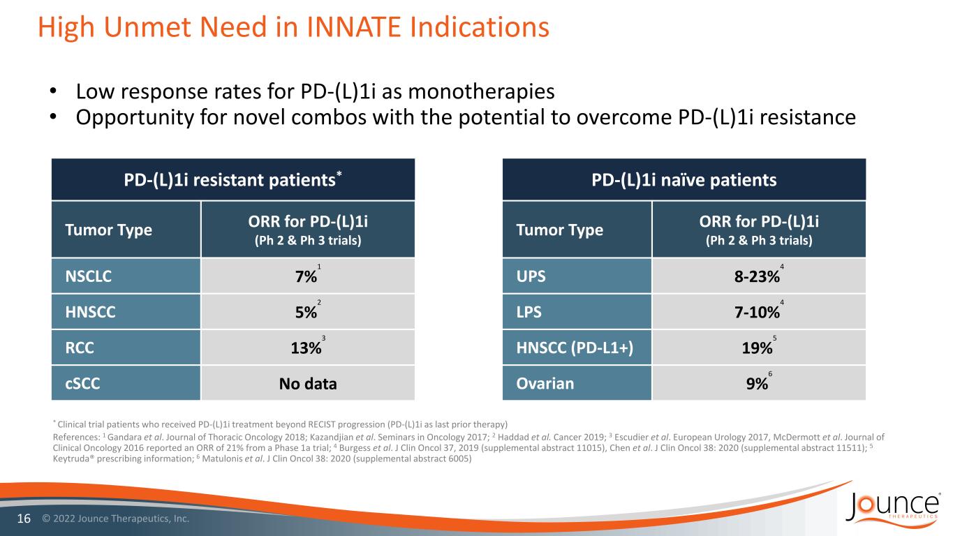 JTX-8064: INNATE Three Categories of Patients Mechanistic potential to improve effectiveness of T cell-directed therapies 15 3/4L Ovarian Cancer (Mono & Combo) No Approved PD-(L)1i (IO Naïve Patients) 1L Head and Neck Squamous Cell Carcinoma Approved PD-1i (IO Naïve Patients) 2/3L clear cell Renal Cell Carcinoma 2-4L Triple Negative Breast Cancer* 2/3L Head and Neck Squamous Cell Carcinoma 2/3L Cutaneous Squamous Cell Carcinoma 2/3L Non-Small Cell Lung Cancer* PD-(L)1i Resistant (progressed on or after PD-(L)1i Tx) 2-4L Sarcoma (UPS and LPS) Clinical Response to T Cell Checkpoint Inhibitors Unmet Medical Needs & Potential for New Mechanisms *Closed to enrollment